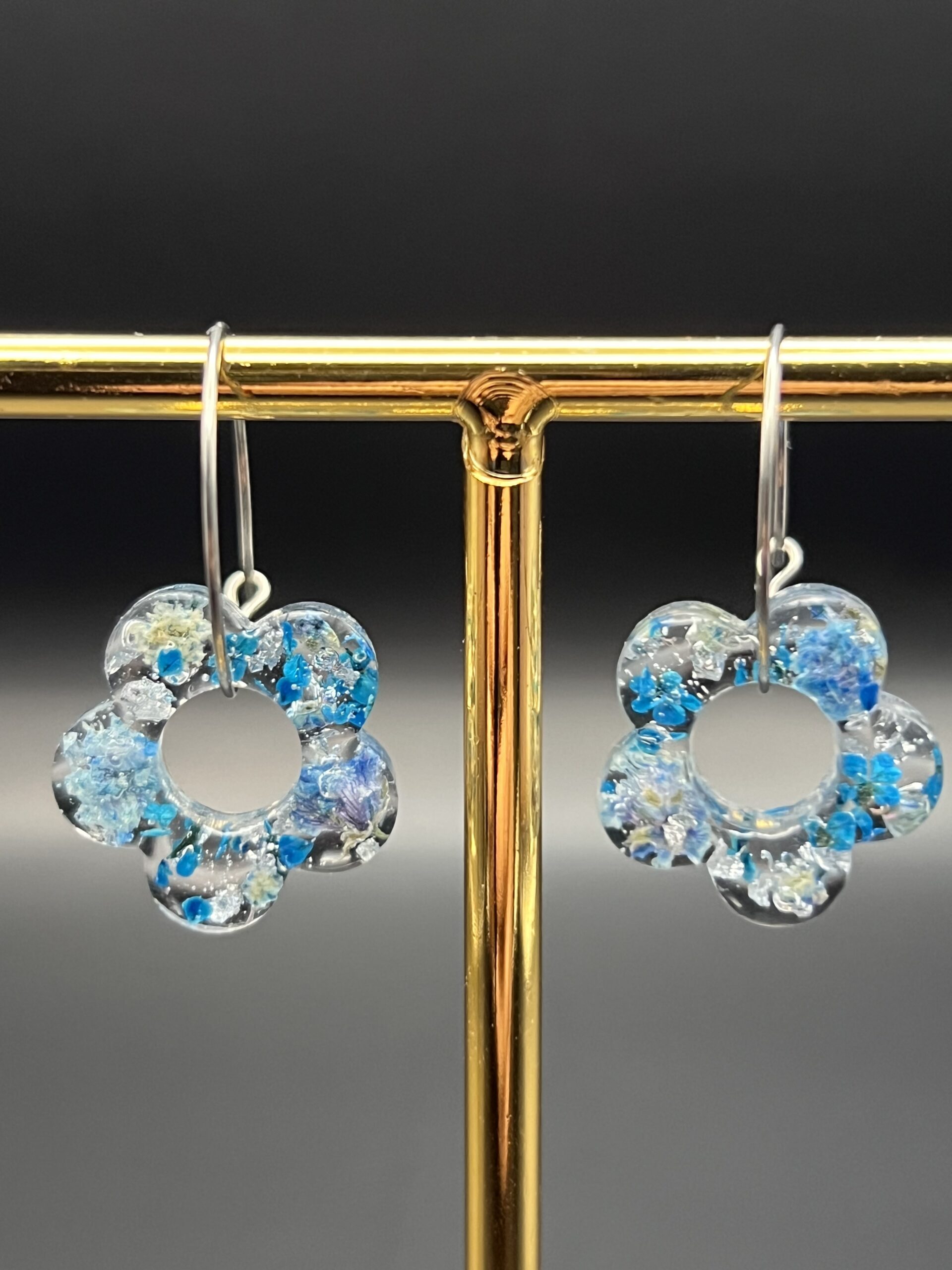 Hoop earrings made out of gypsophila and blue Queen Anne’s Lace embedded in resin.