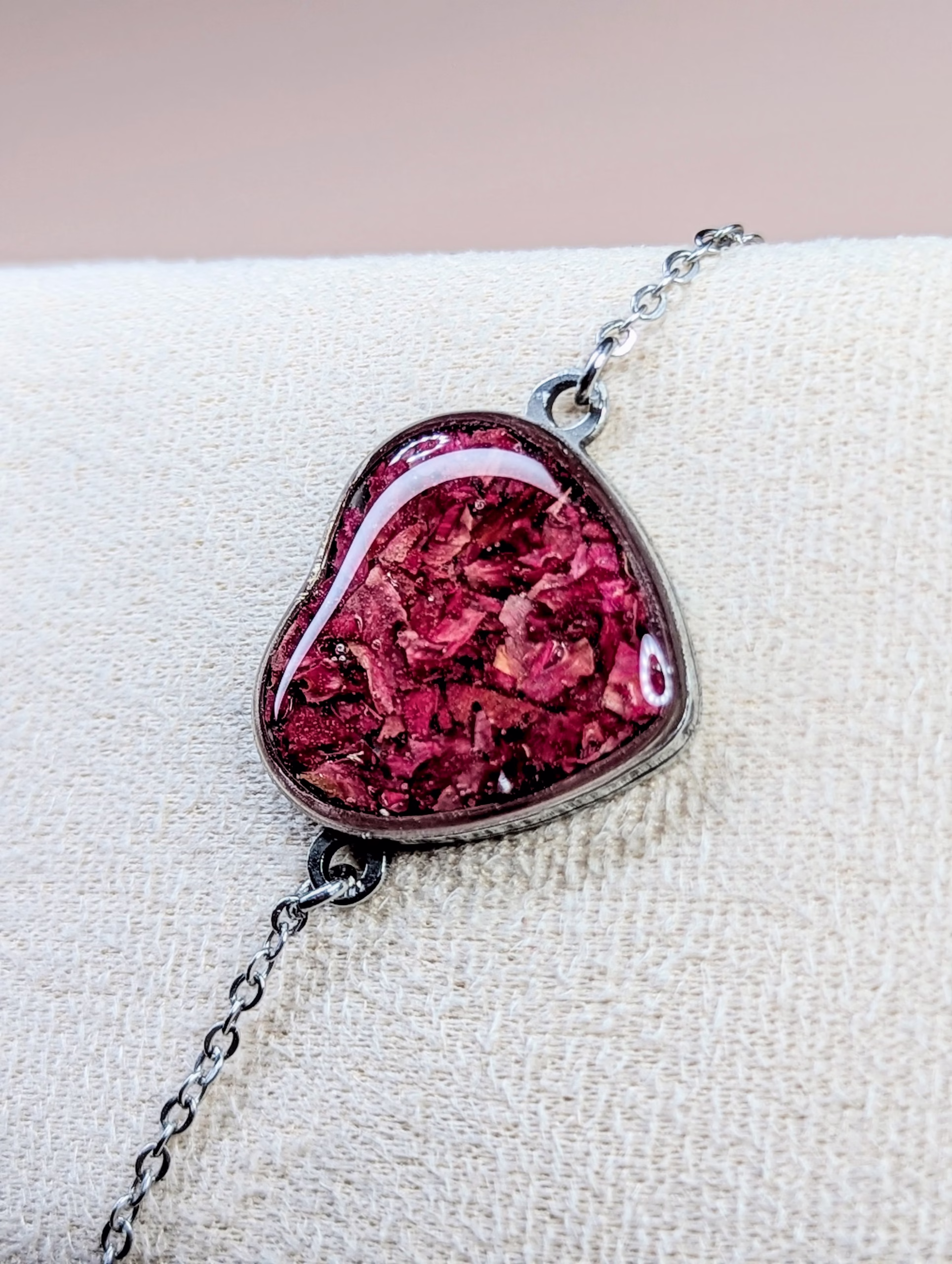 Heart bracelet made out of carnation crushed petals embedded in epoxy resin.