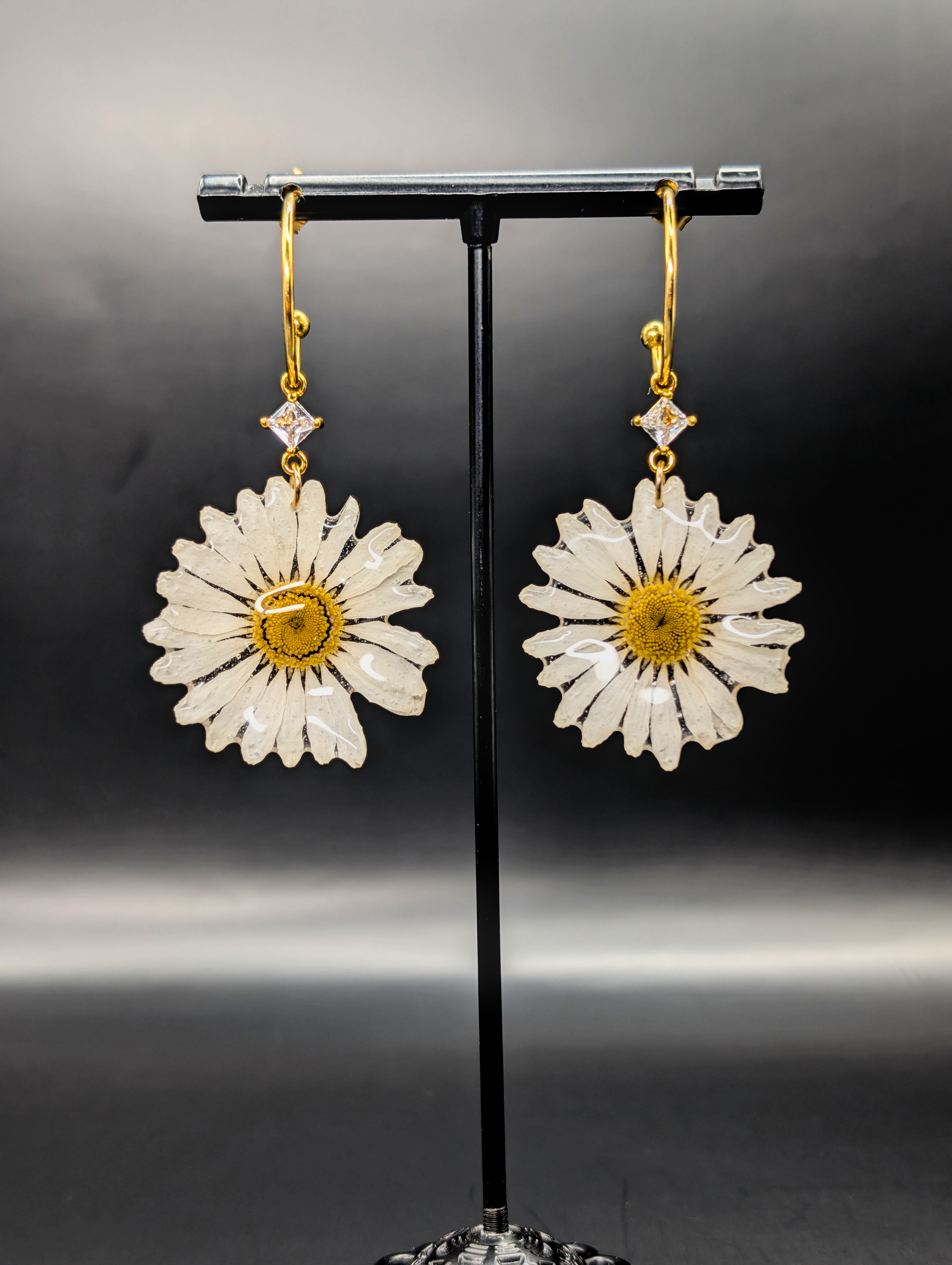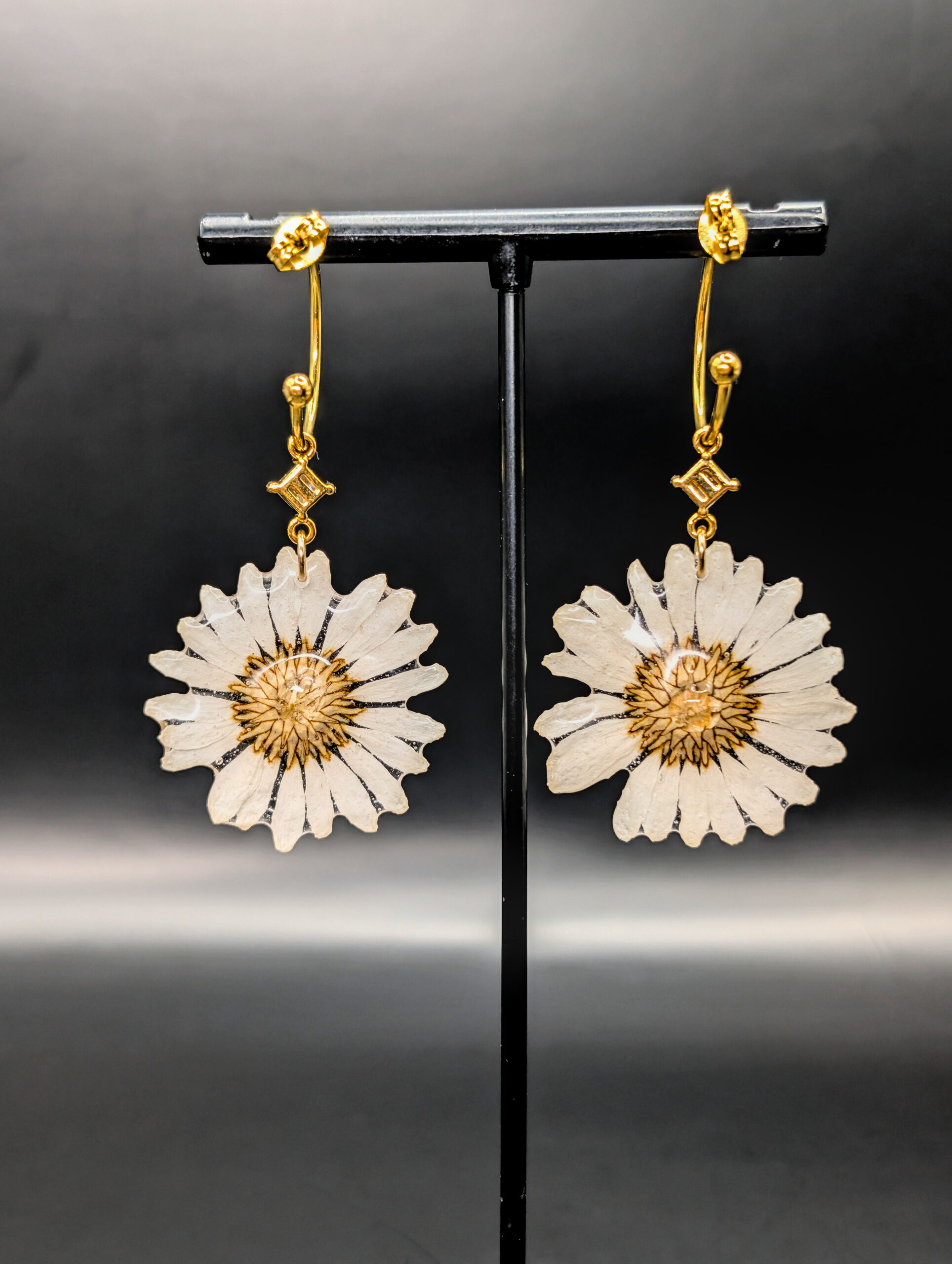 Hoop earrings made out of real daisy flowers embedded in resin.