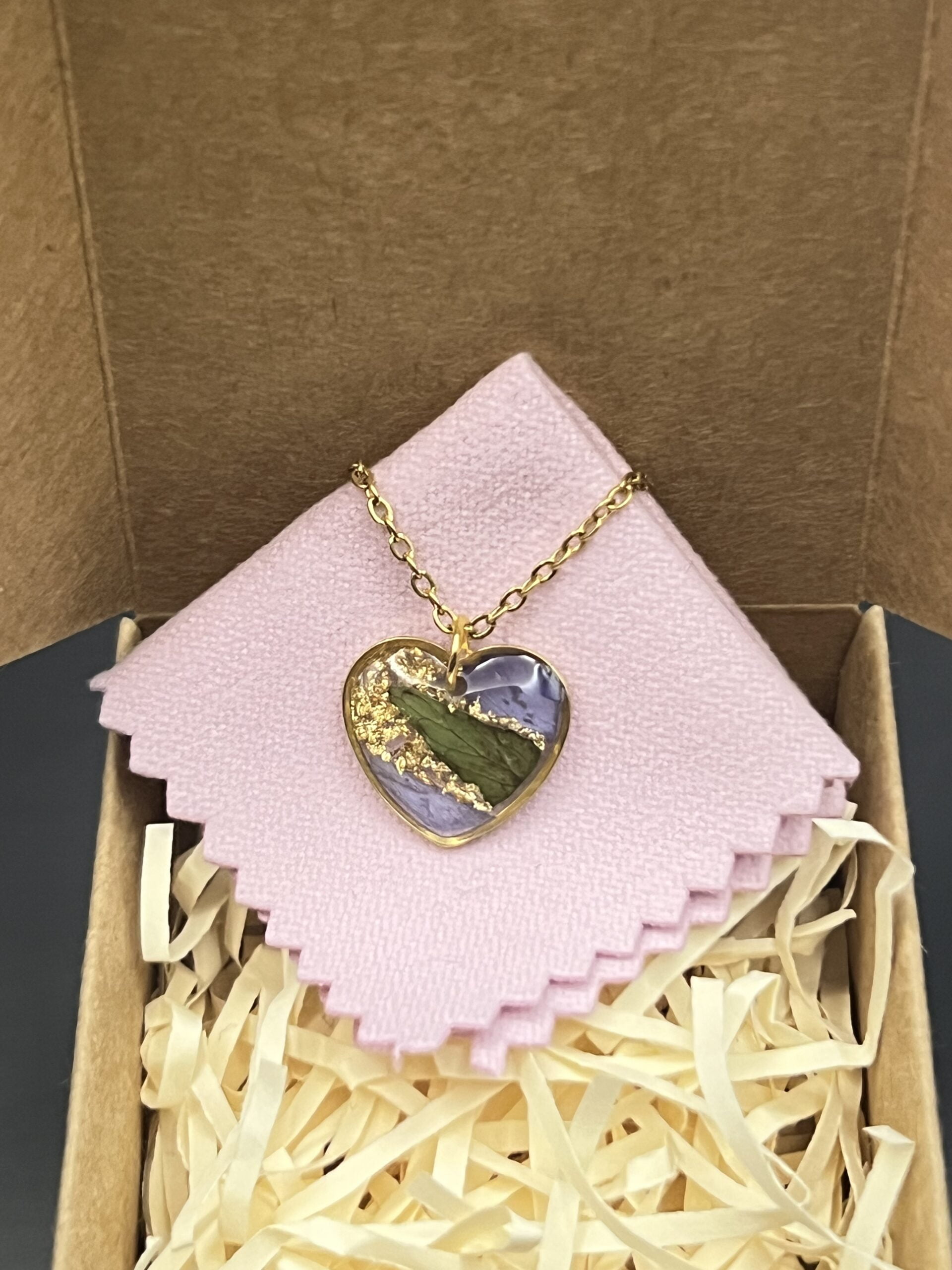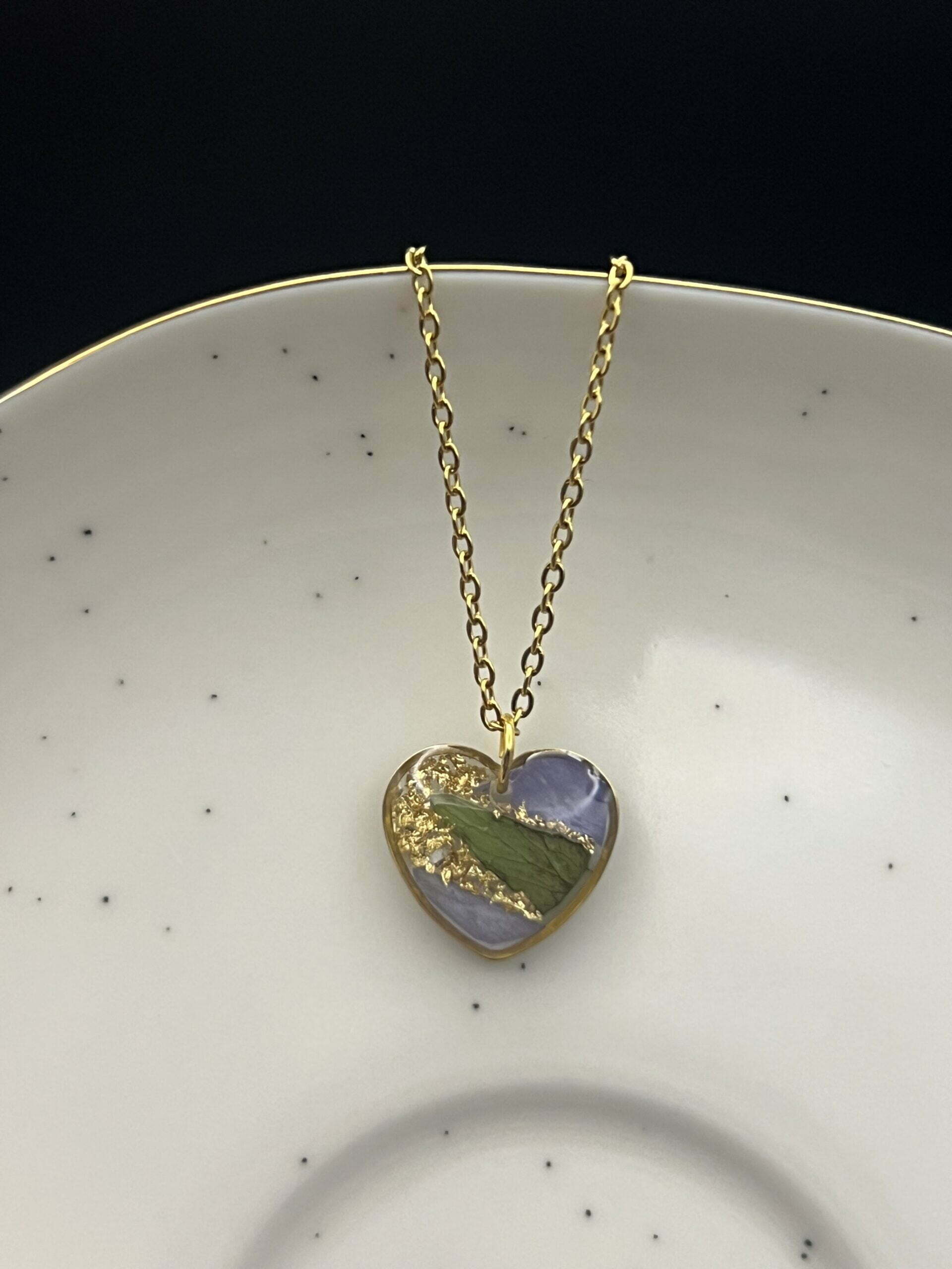 Heart necklace made out of dianthus petal, leaf & gold flakes embedded in epoxy resin.
