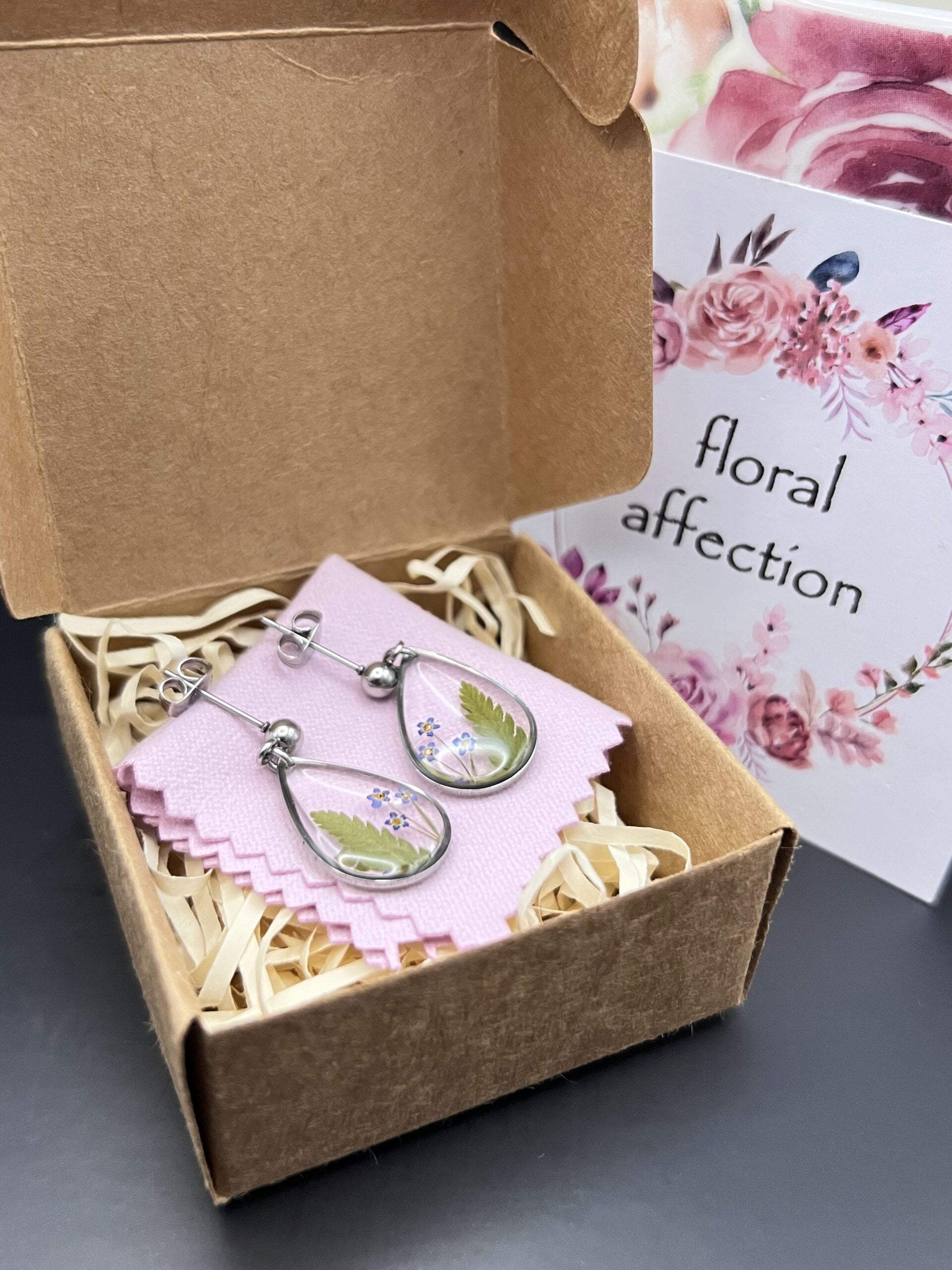 Fern & forget me nots teardrop silver stud drop earrings