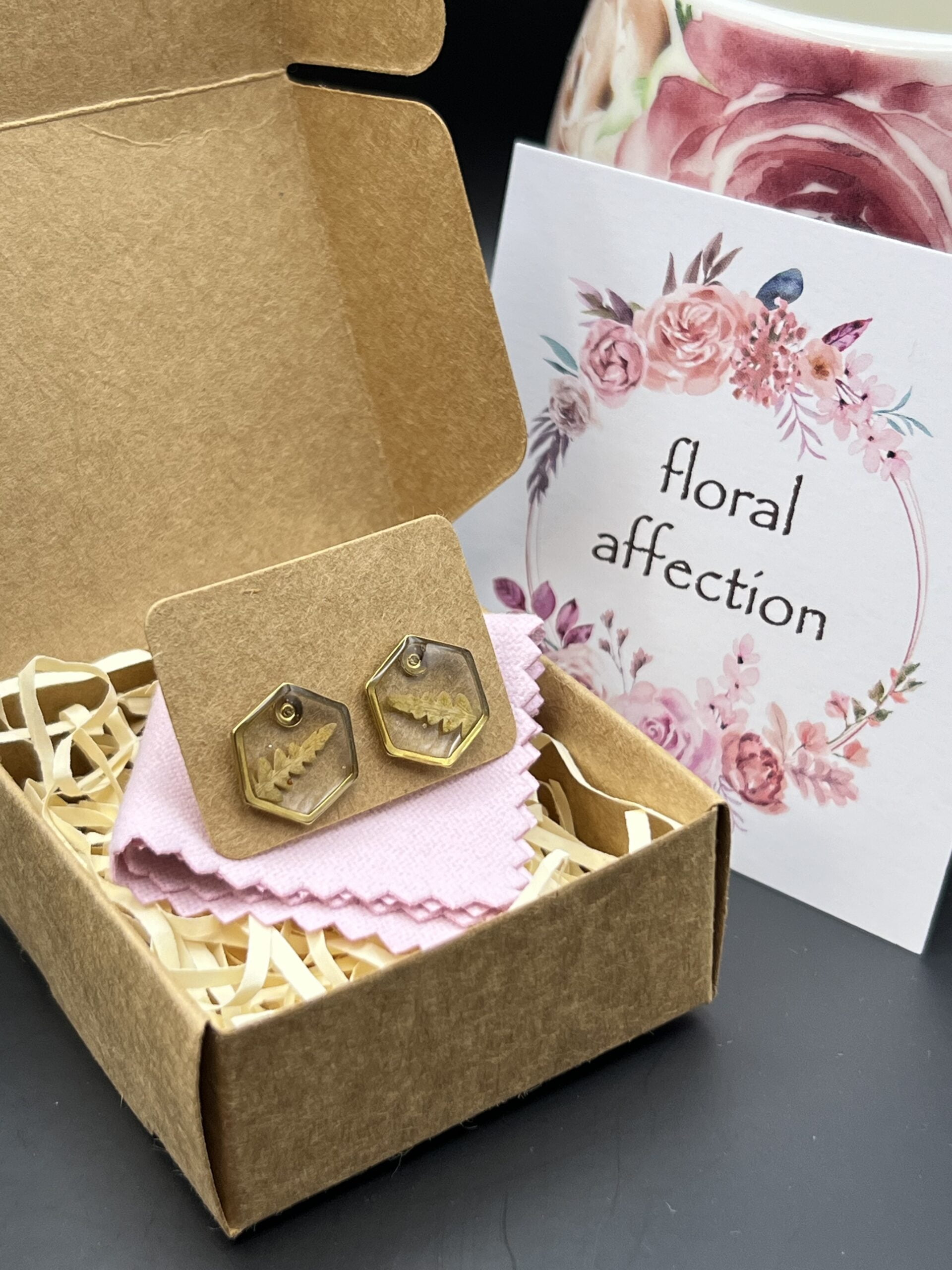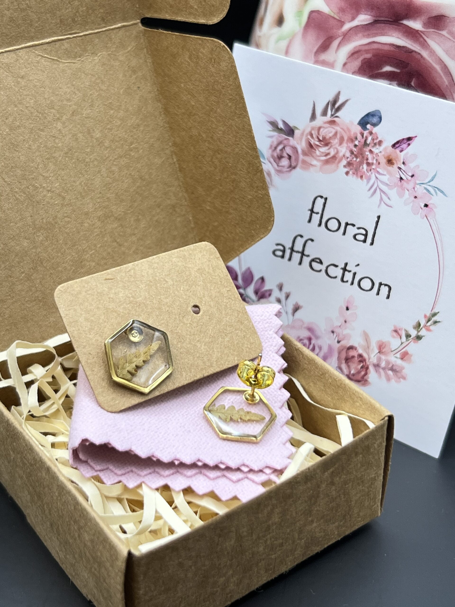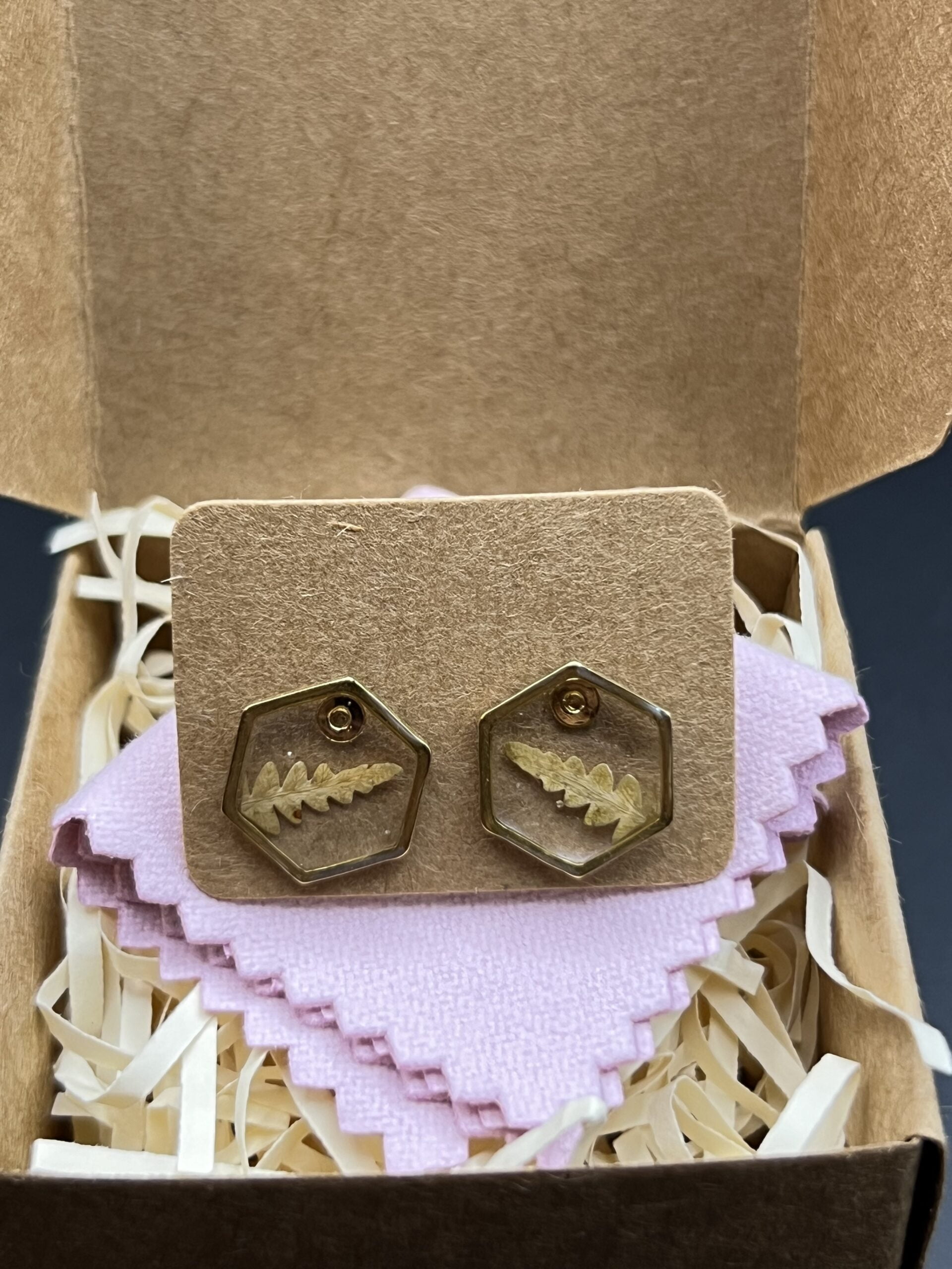 Small gold hexagon earrings made out of fern embedded in epoxy resin.