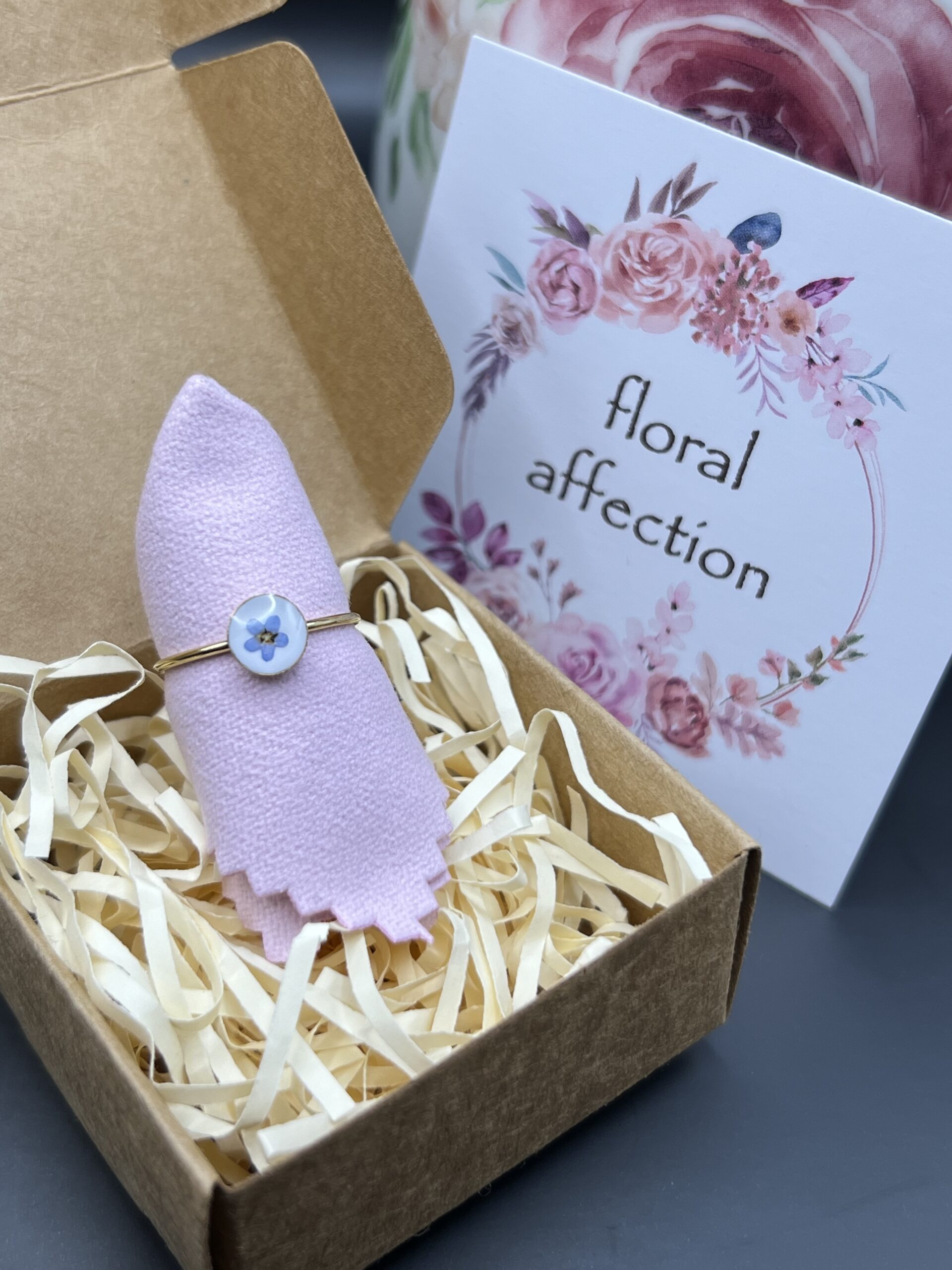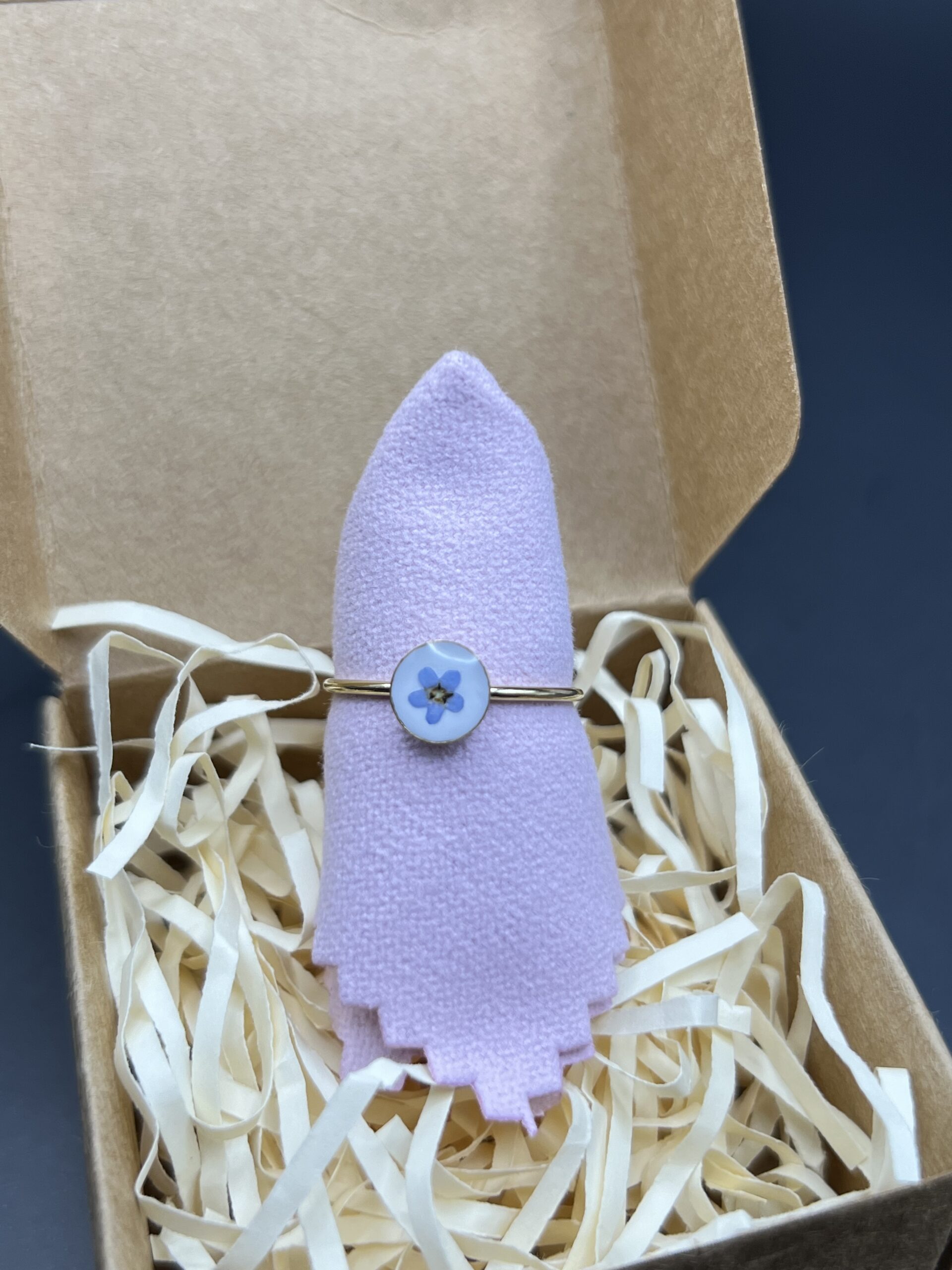 Round gold filled ring size N made out of forget me not flower embedded in epoxy resin.