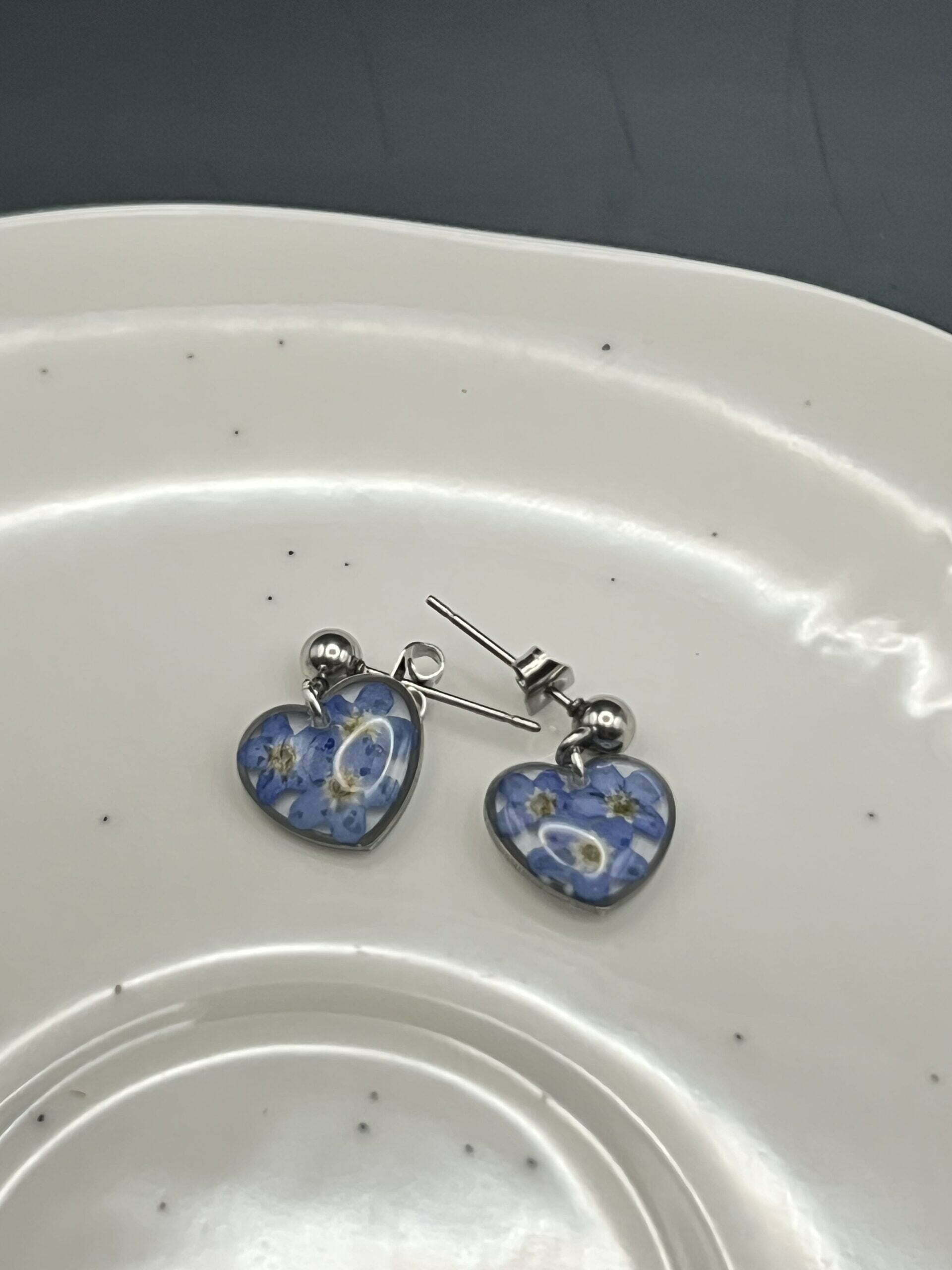Small heart earrings made out of forget me not flowers embedded in epoxy resin.