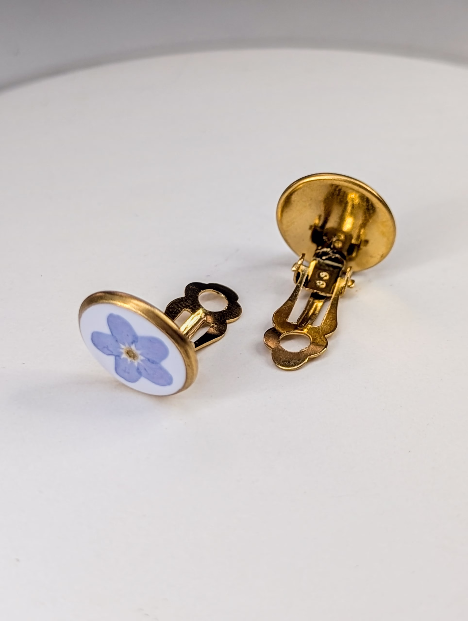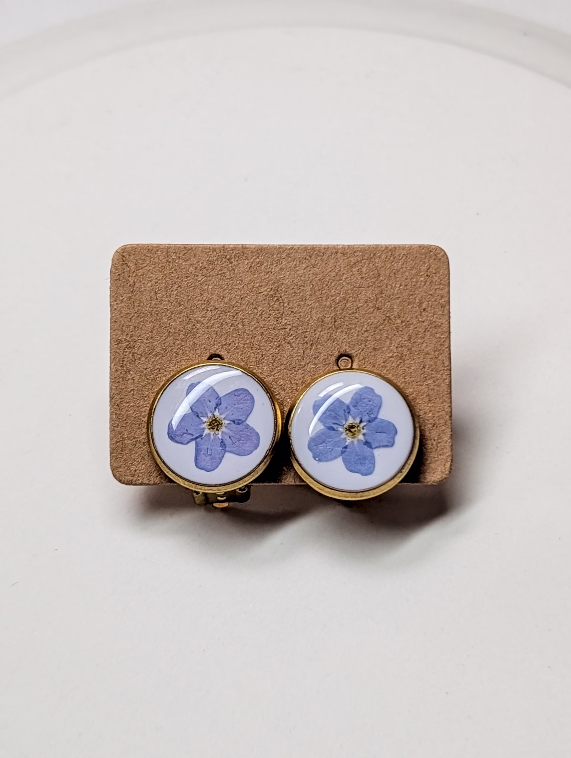 Round clip-ons made out of Forget me not flowers embedded in epoxy resin.