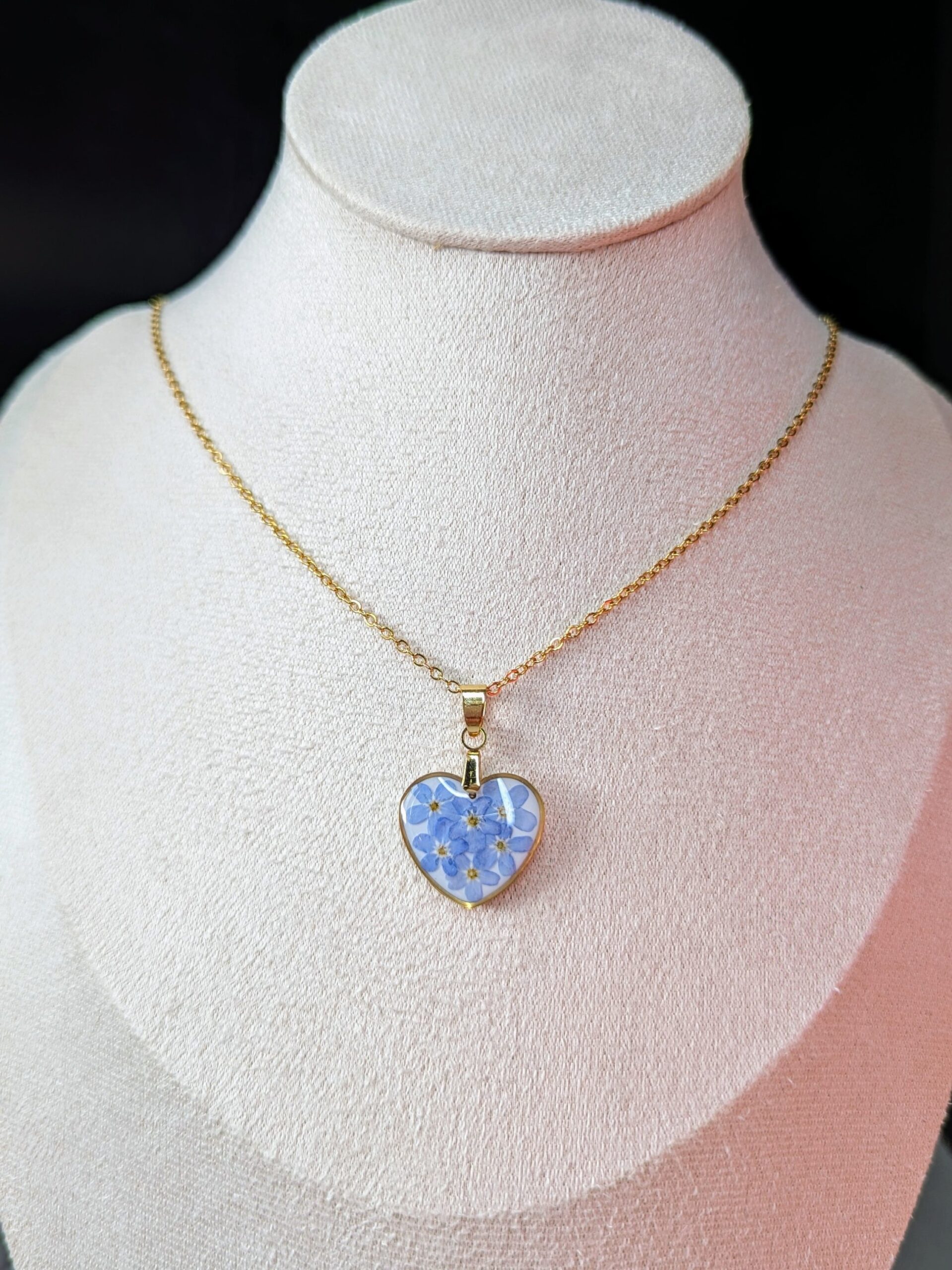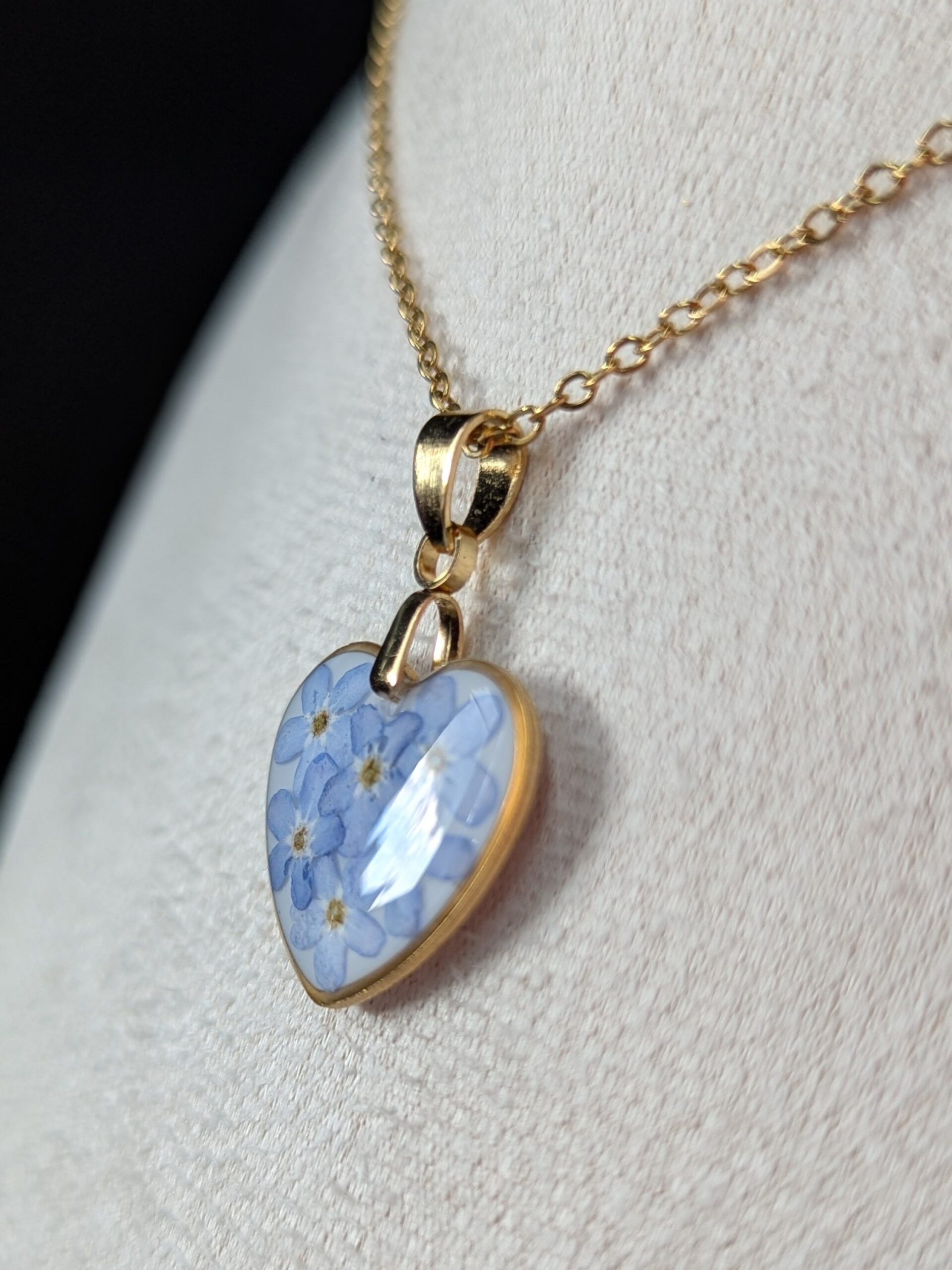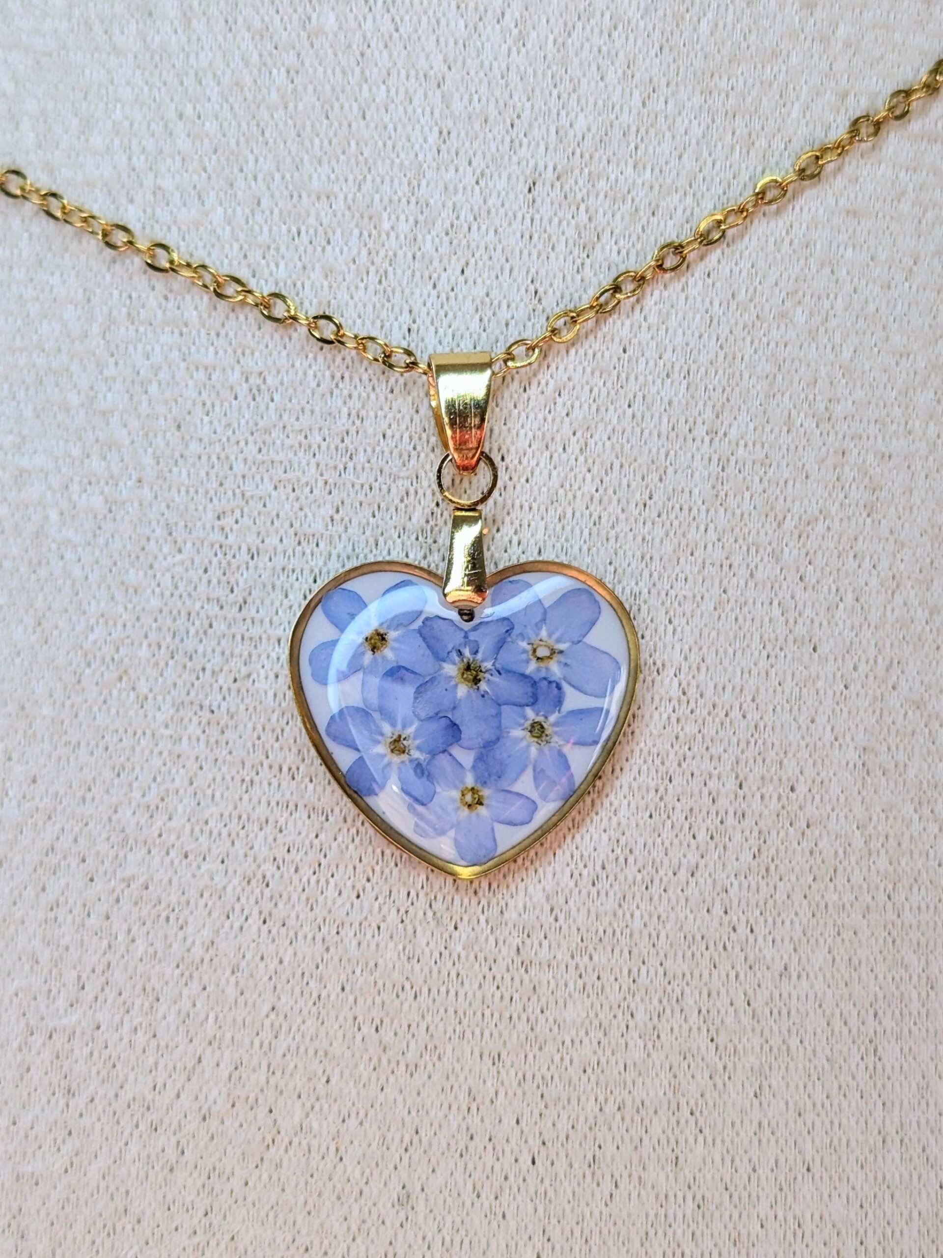 Heart necklace made out of Forget me not flowers embedded in resin.