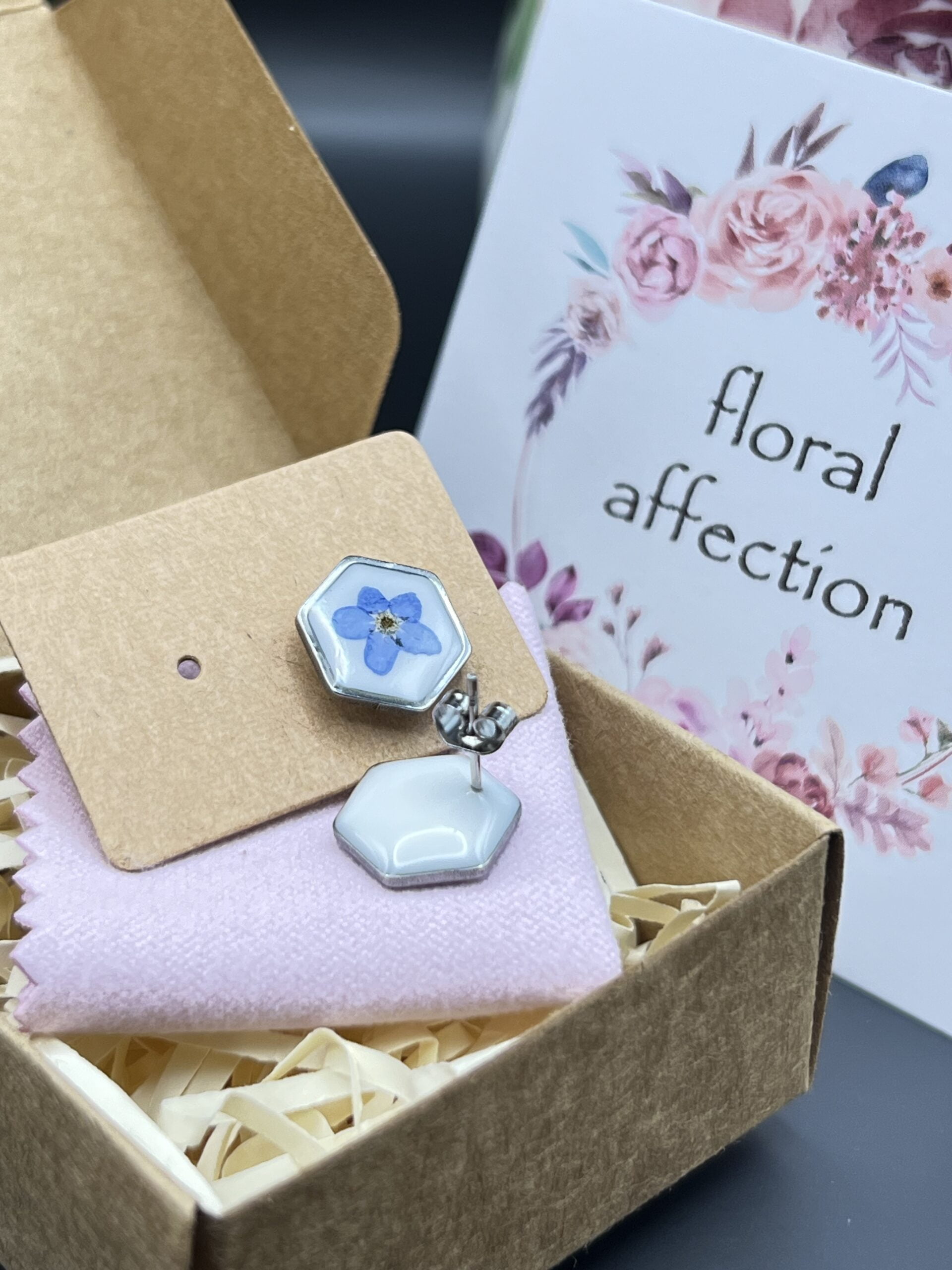 Hexagon stud earrings made out of Forget me not flowers embedded in epoxy resin.
