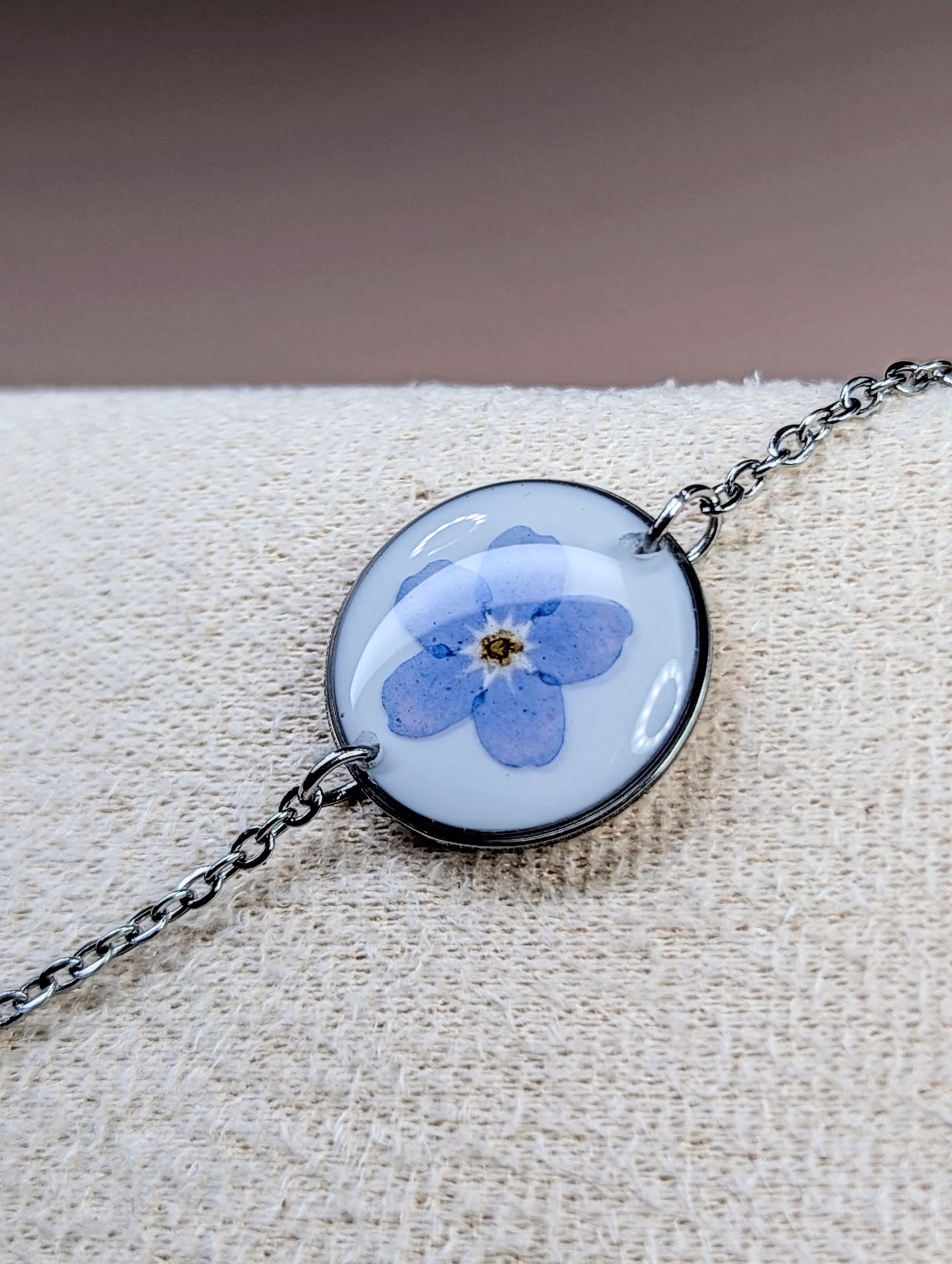 Round bracelet made out of Forget me not flower embedded in epoxy resin.