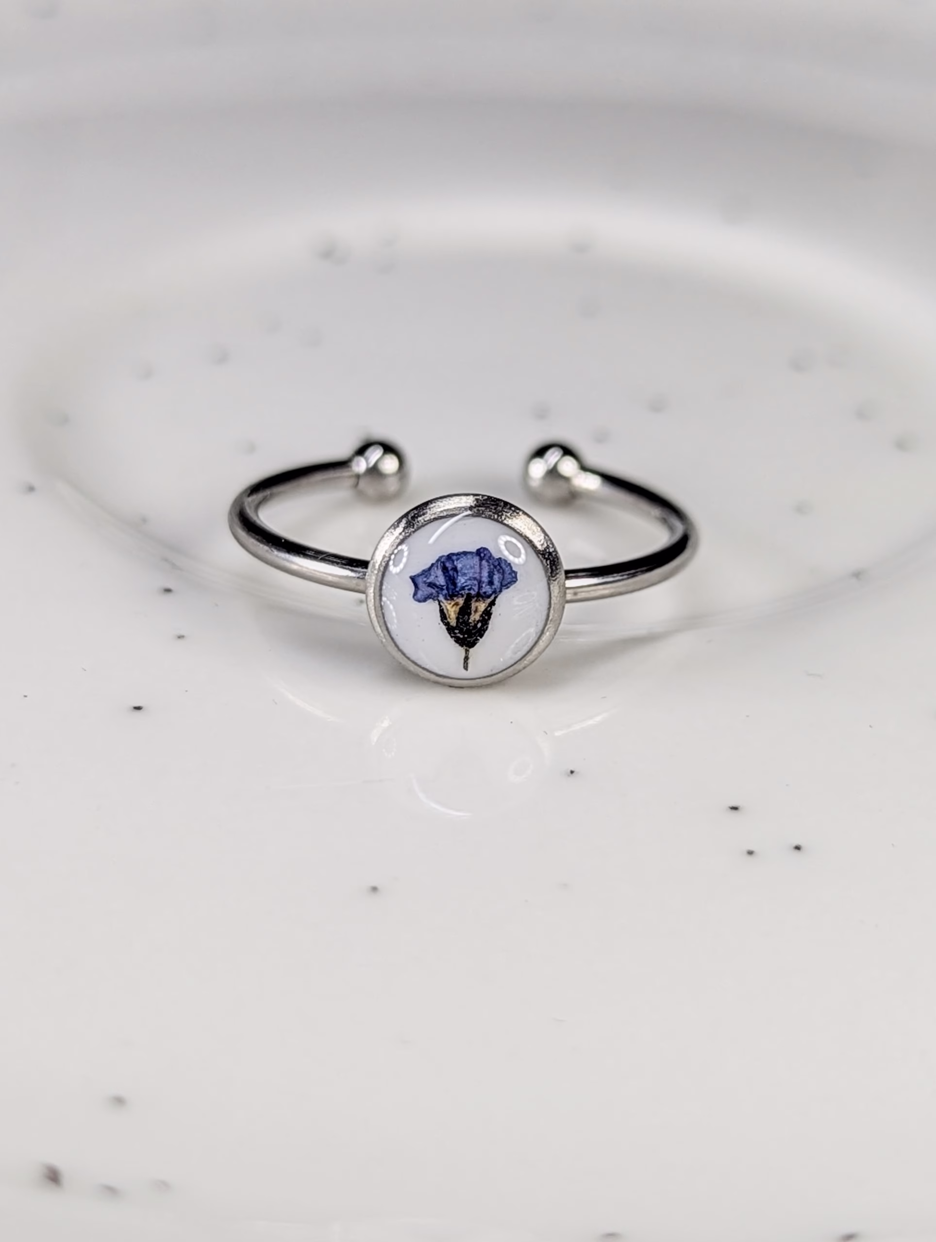 Round silver adjustable ring made out of forget me not flower embedded in resin.
