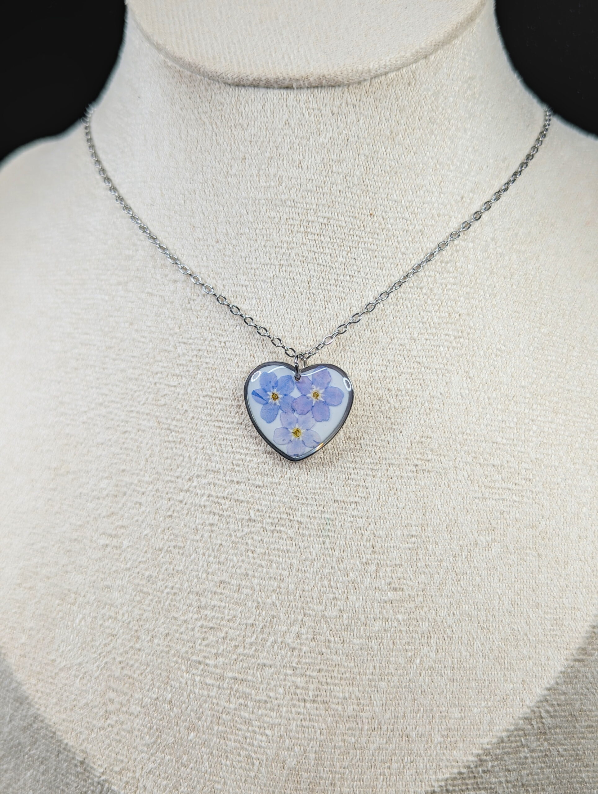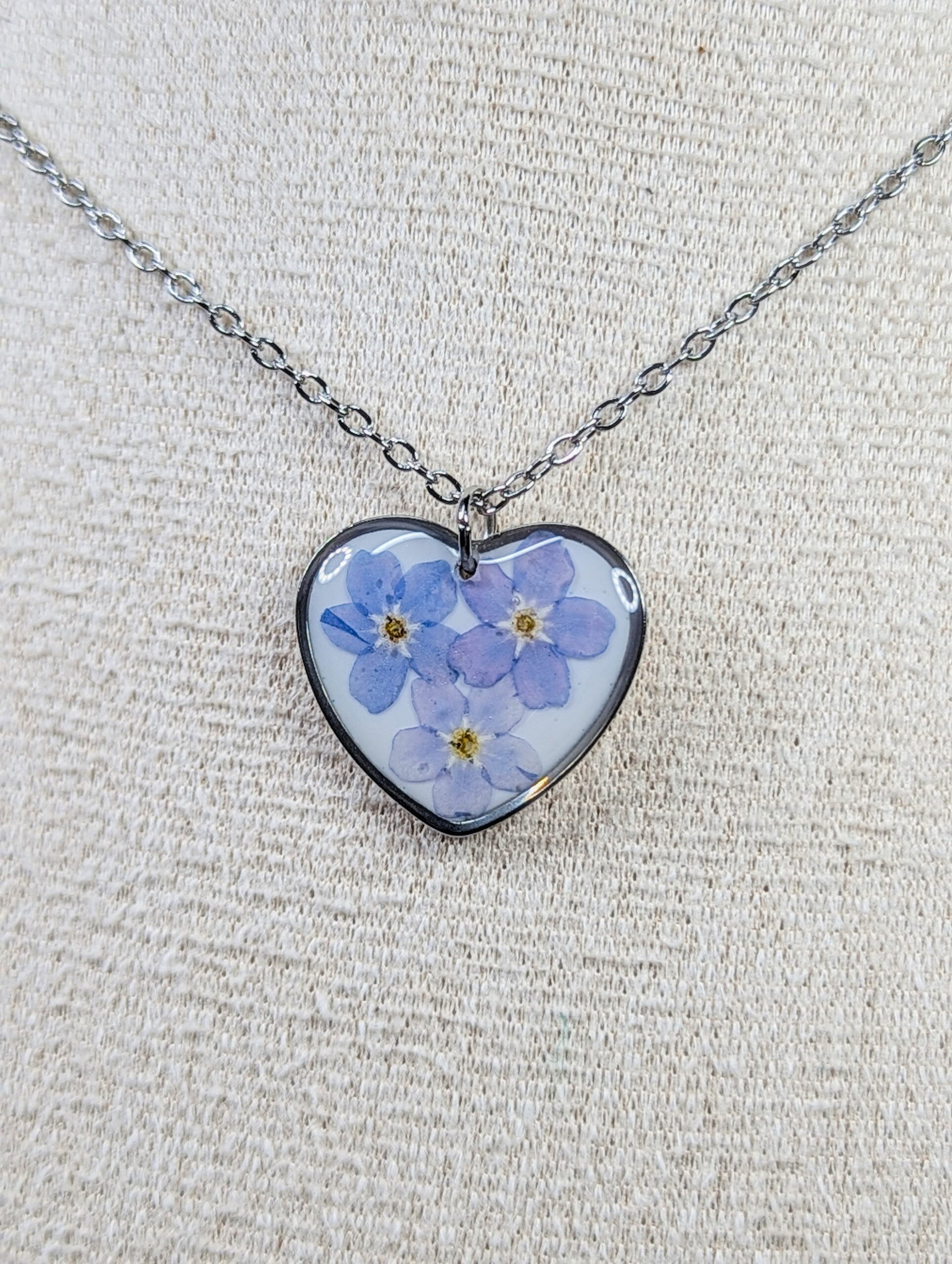 Heart necklace made out of Forget me not flowers embedded in resin.