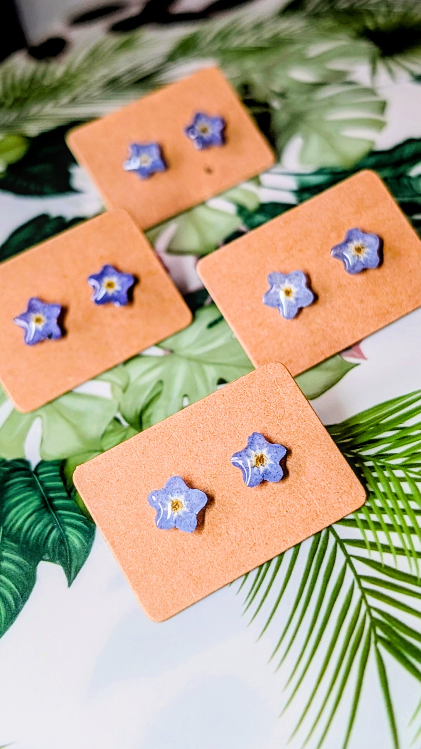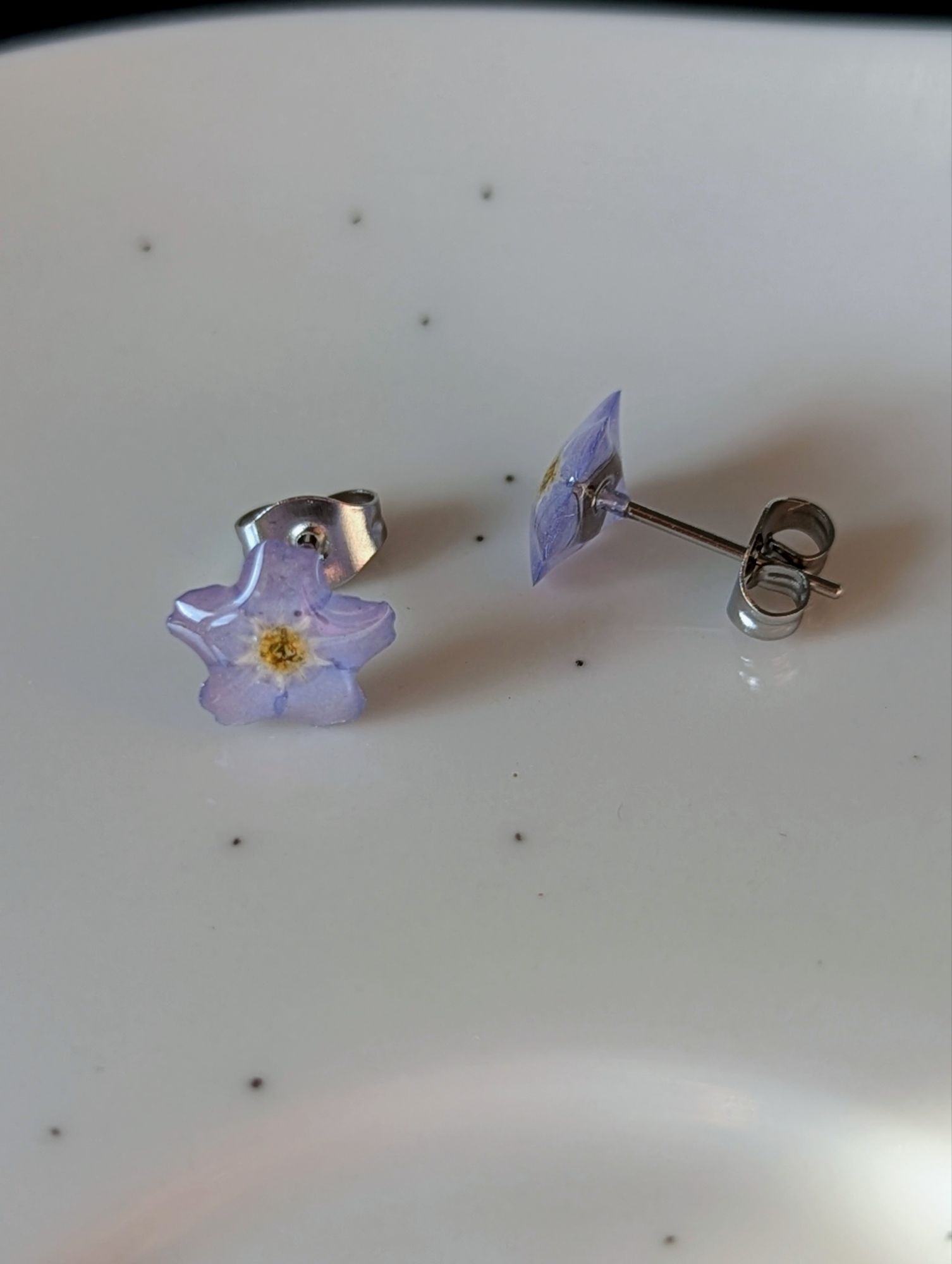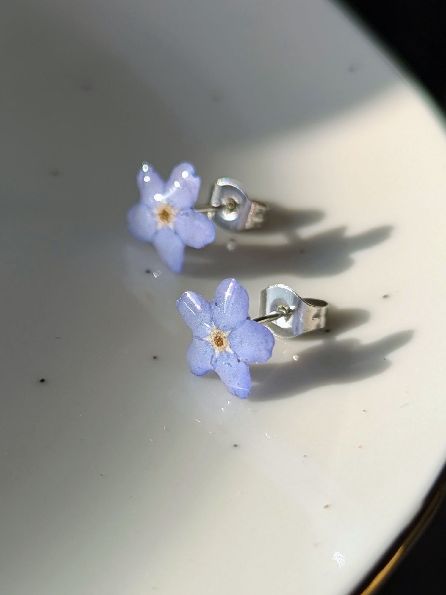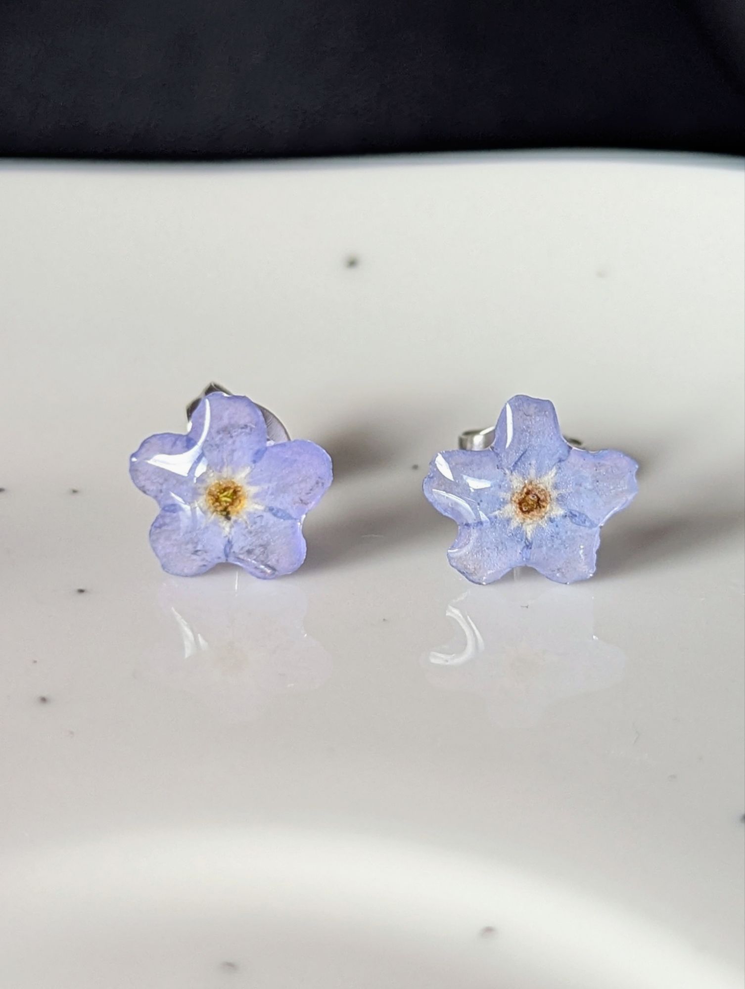 Stud earrings made out of Forget Me Not flowers embedded in resin.
