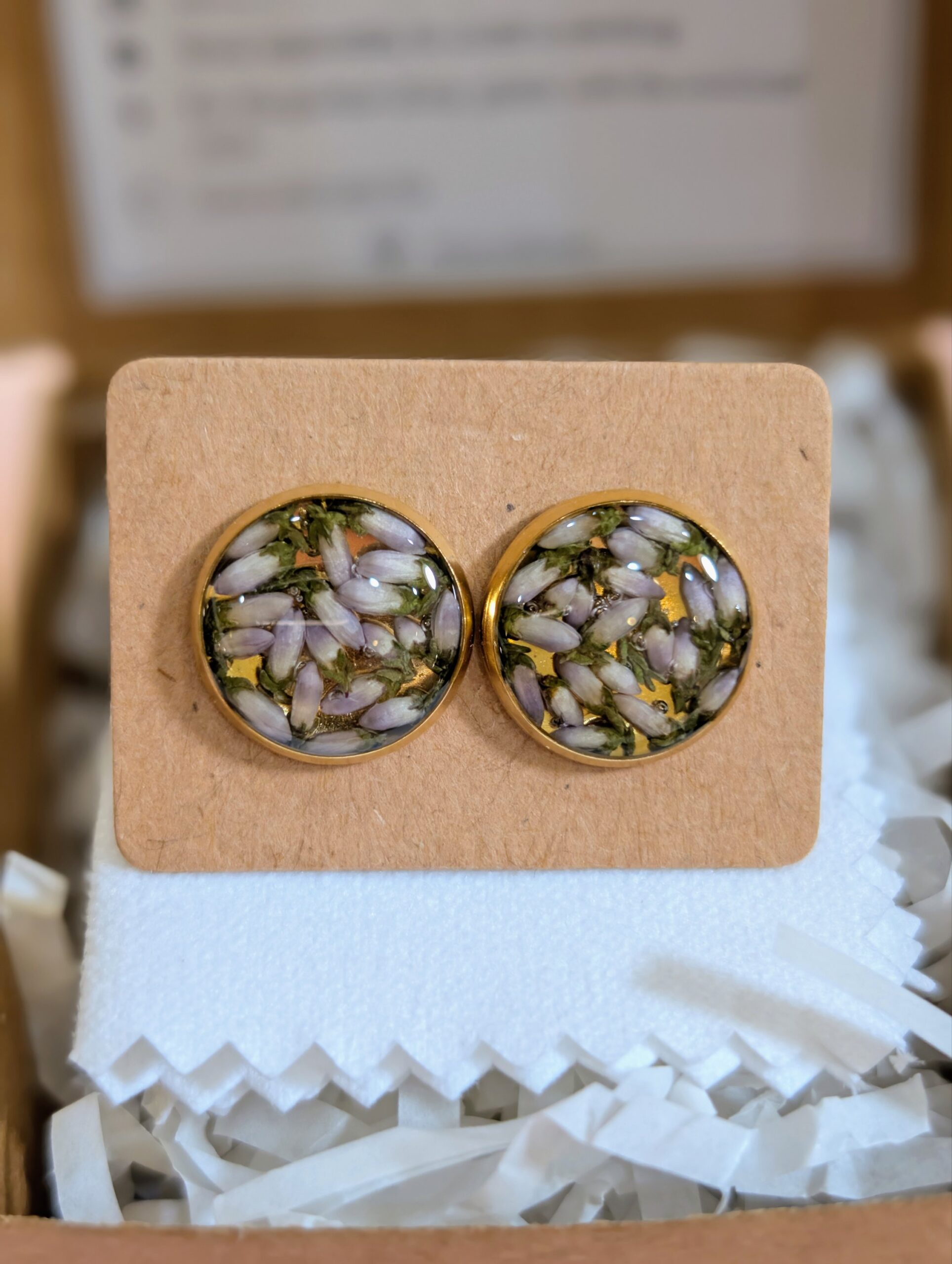 Round earrings made out of Heather flowers embedded in resin.