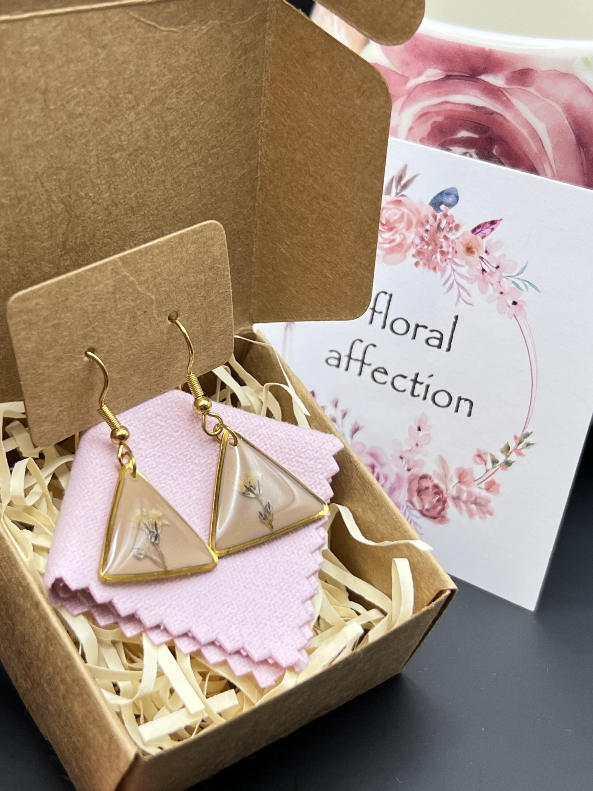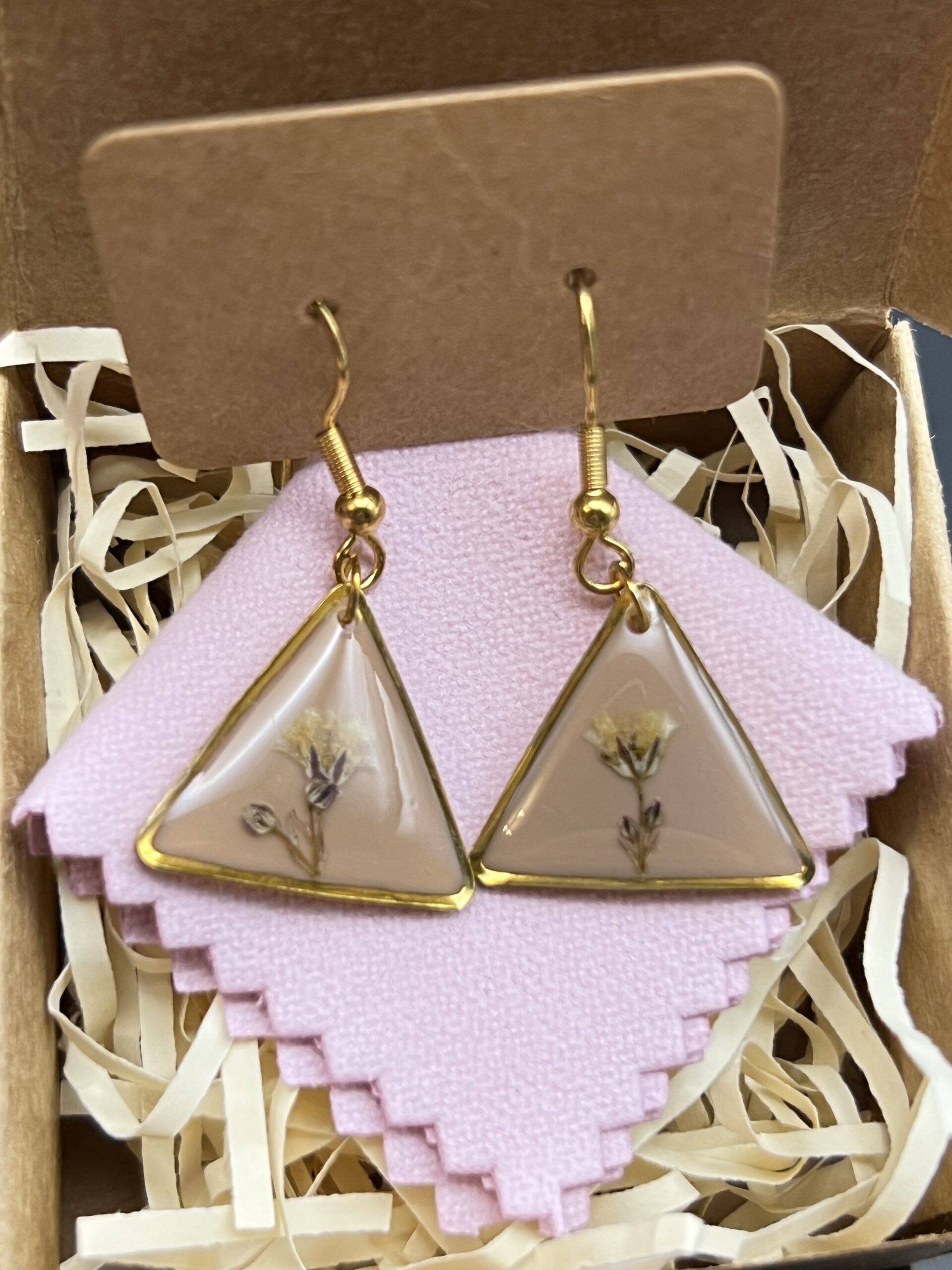 Triangle earrings made out of gypsophila flowers embedded in epoxy resin.