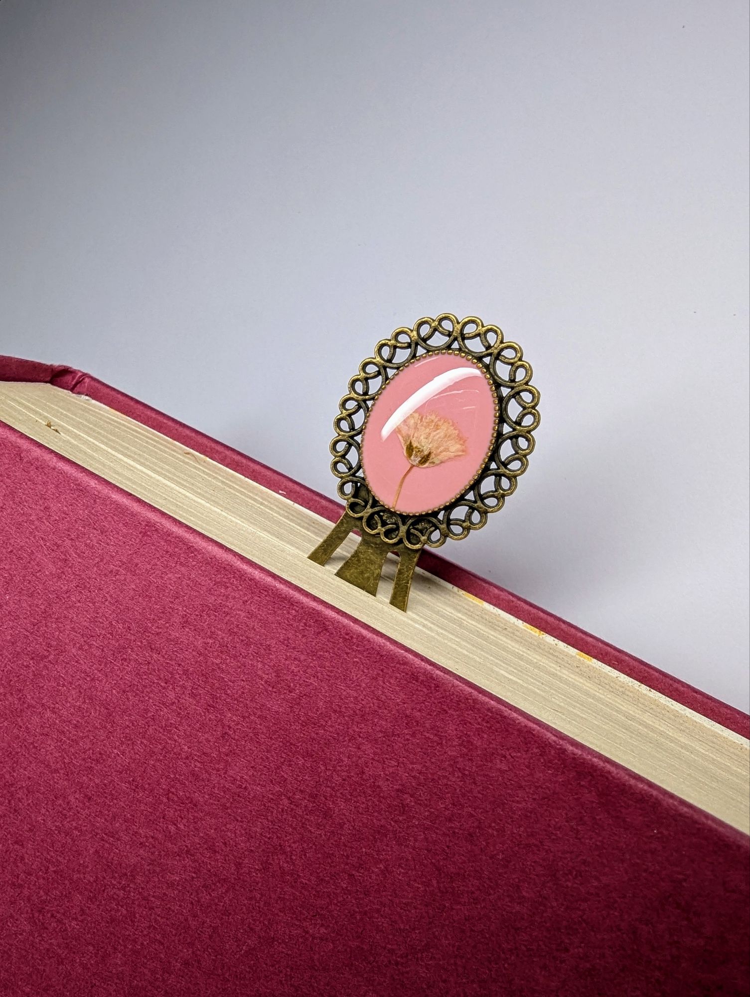 Oval bookmark made out of Gypsophila flower embedded in epoxy resin.