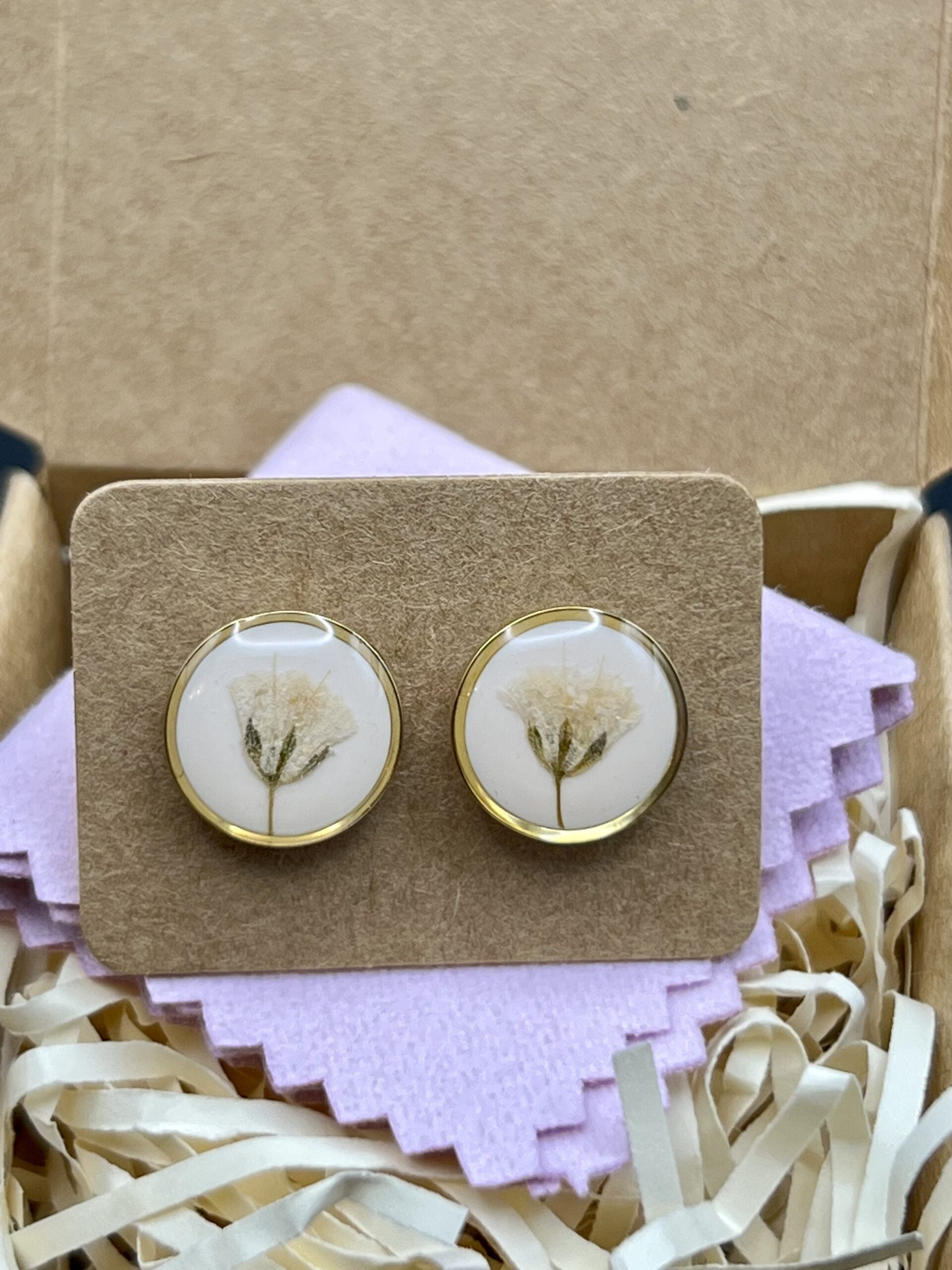 Round stud earrings made out of Gypsophila flowers embedded in epoxy resin.