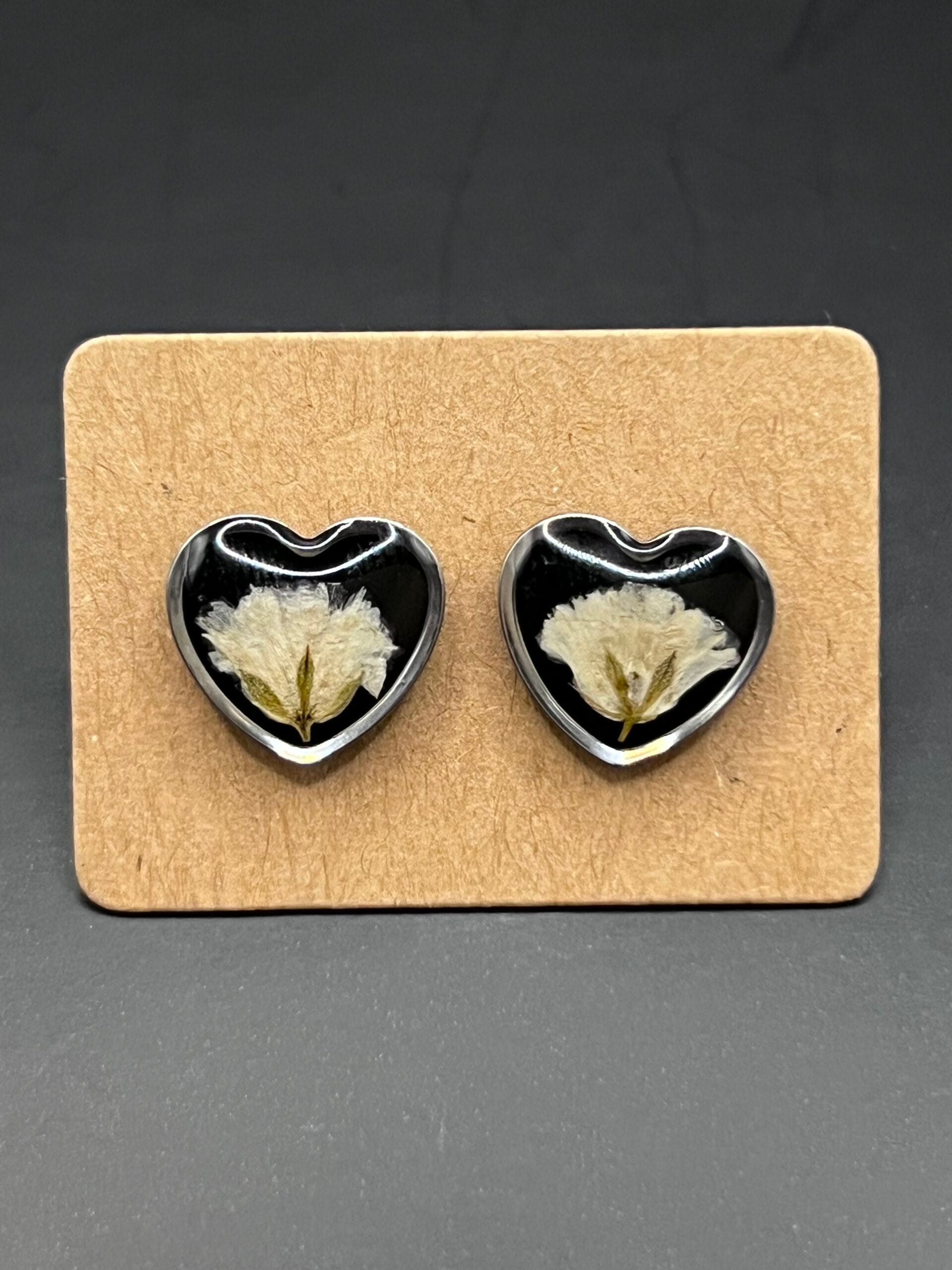 Heart earrings made out of Gypsophila flower embedded in resin.