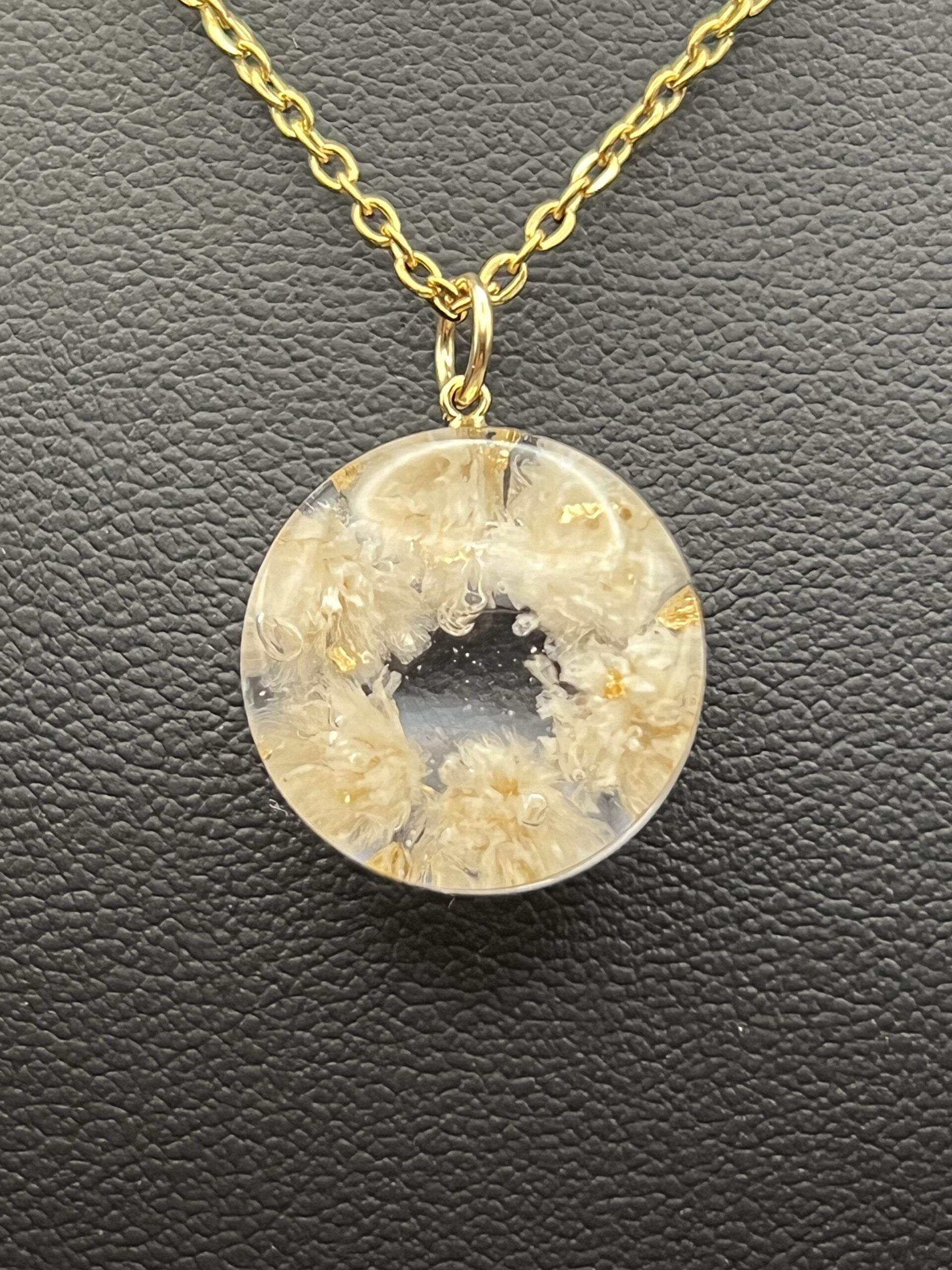 Necklace made out of Gypsophila embedded in resin.