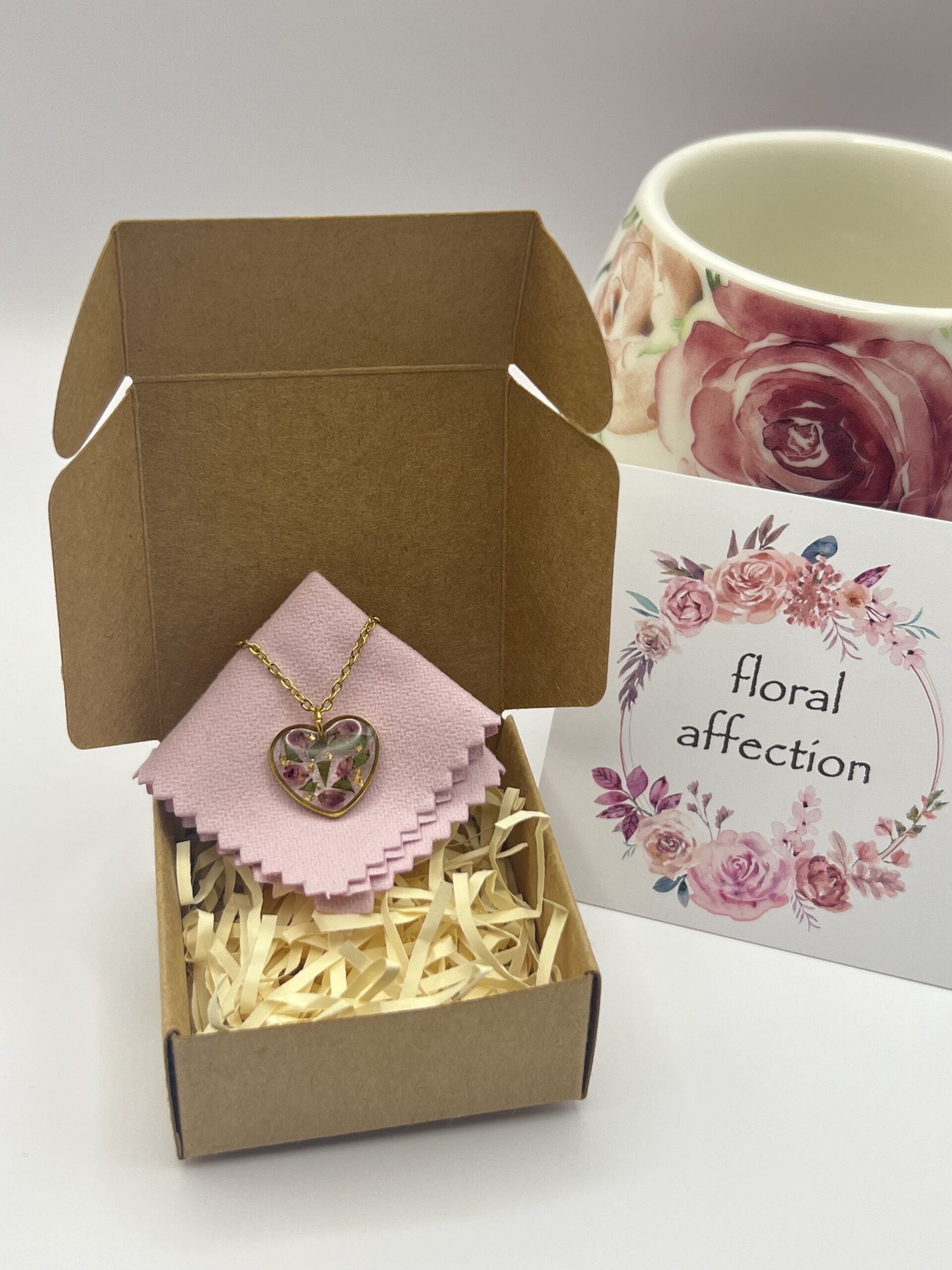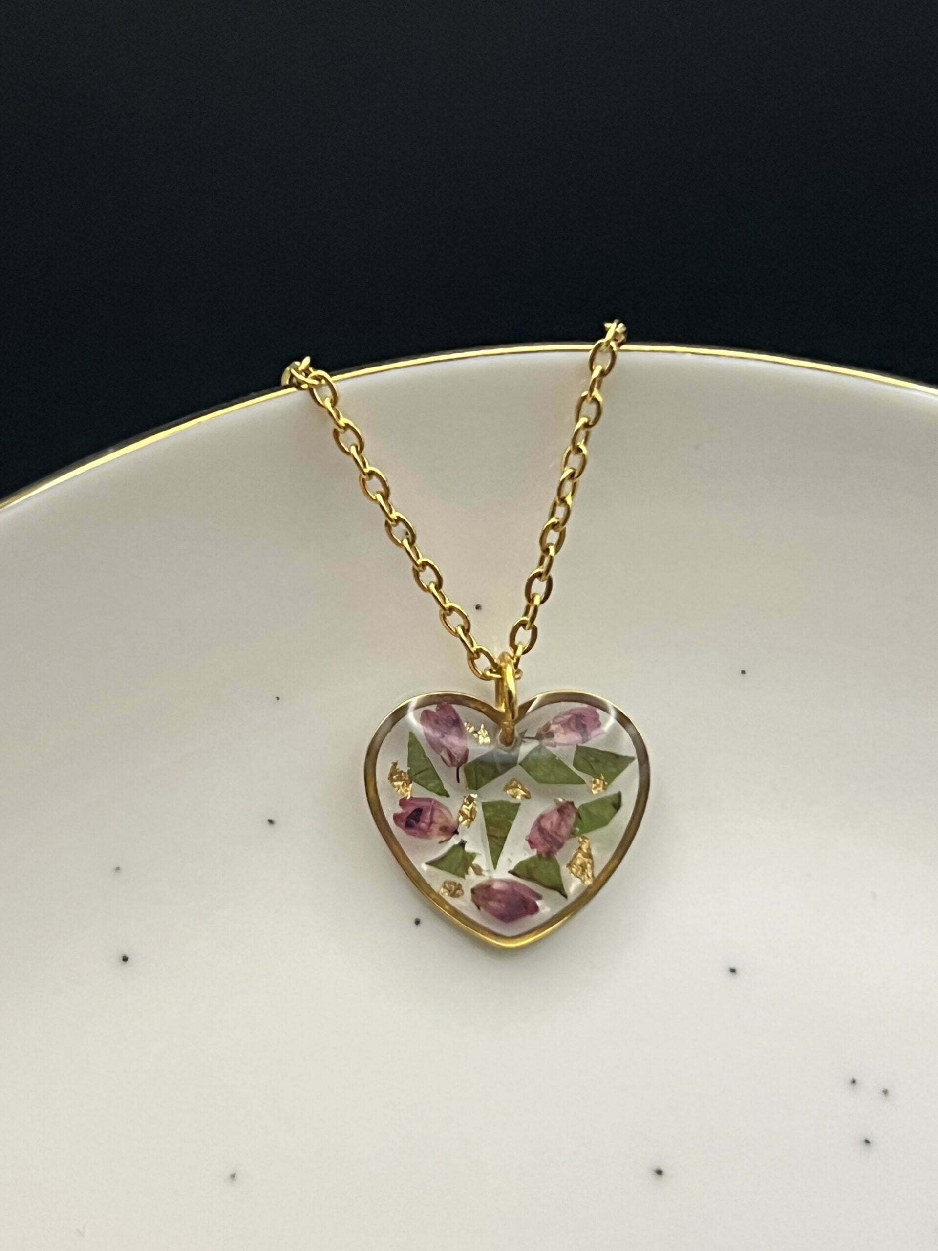 Heather flowers & leaves heart gold stainless steel resin necklace