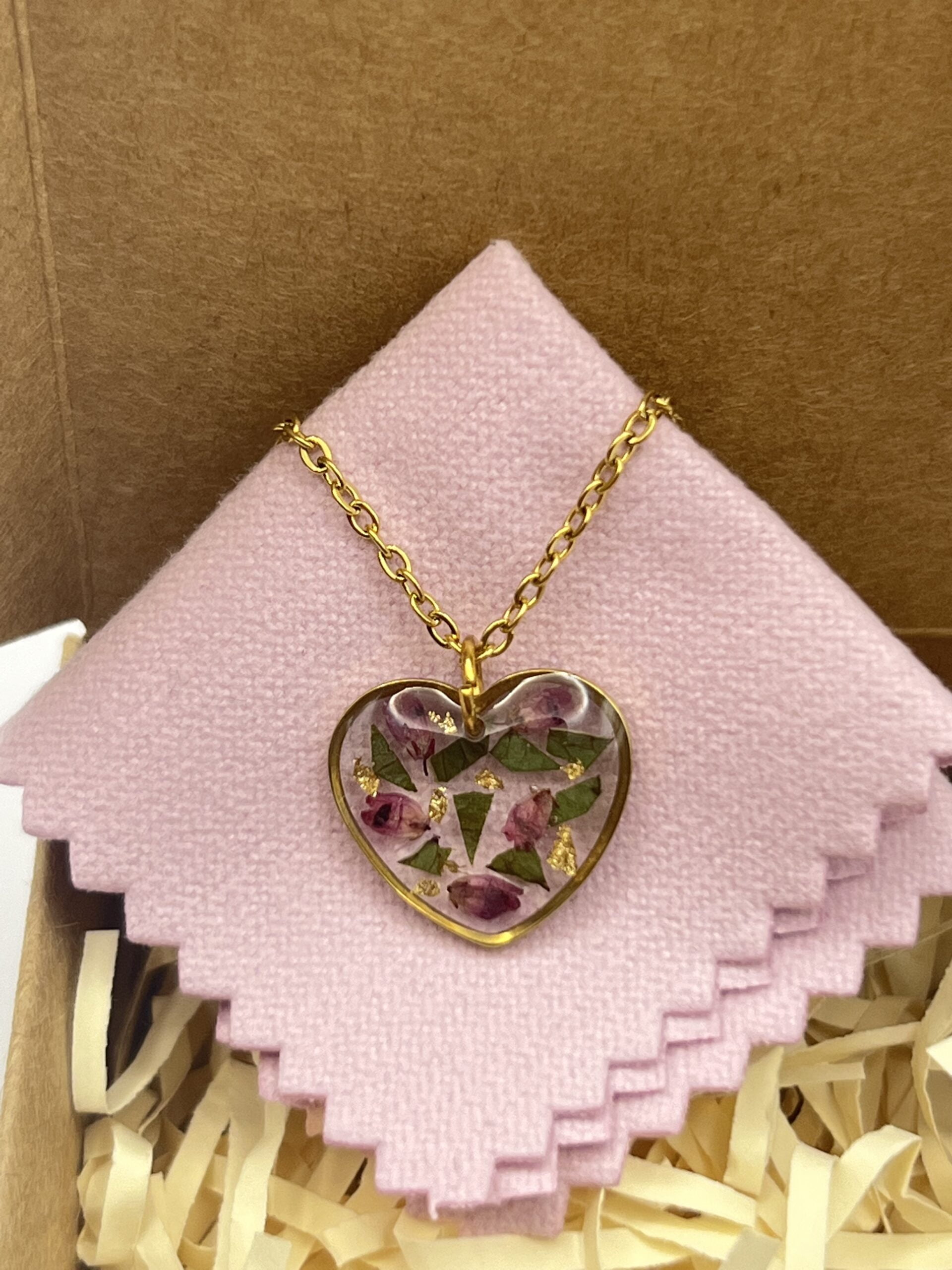 Heart necklace made out of heather flowers & leaves & gold flakes embedded in epoxy resin.