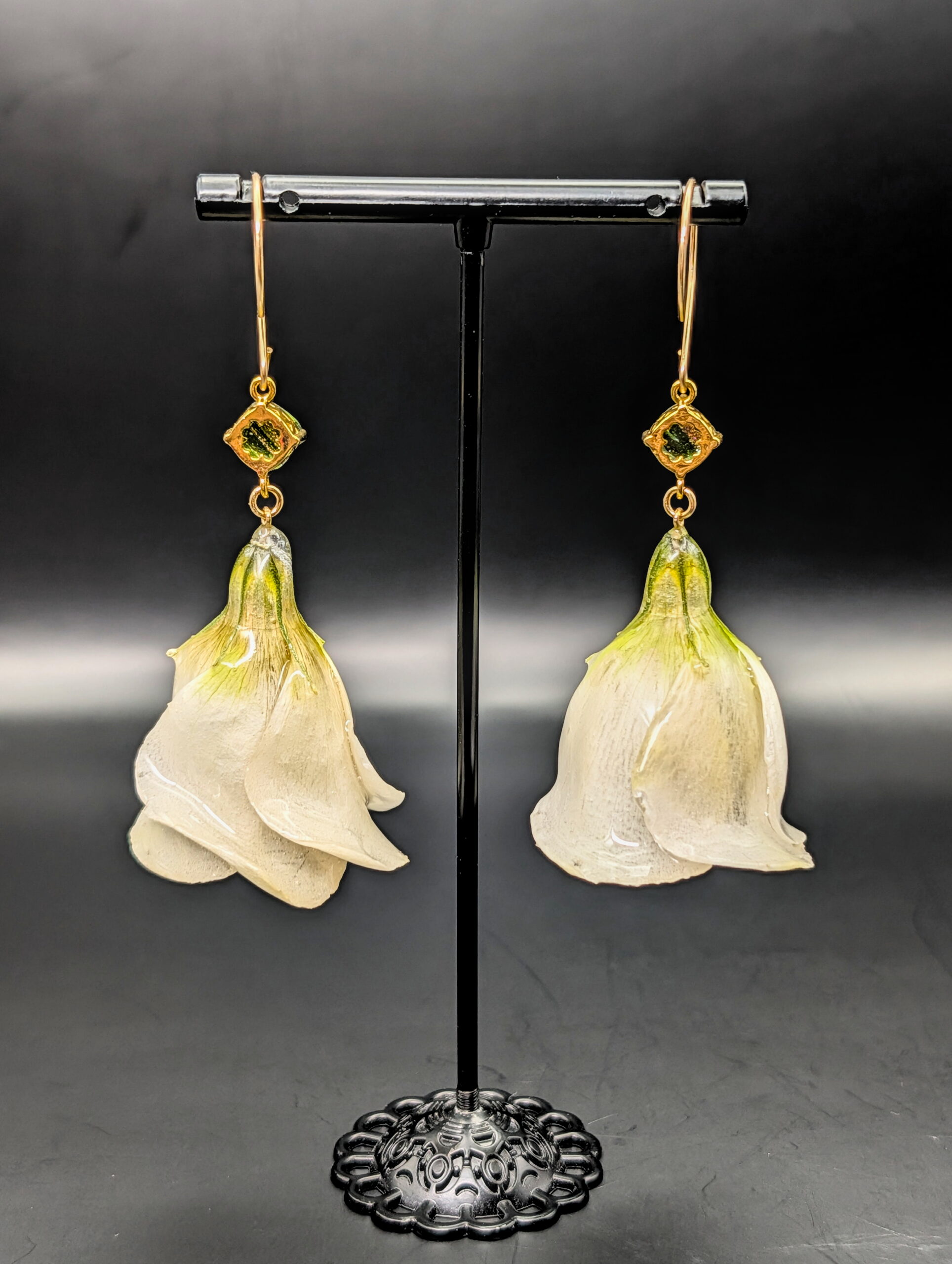 Drop earrings made out of real lisianthus flowers embedded in resin.