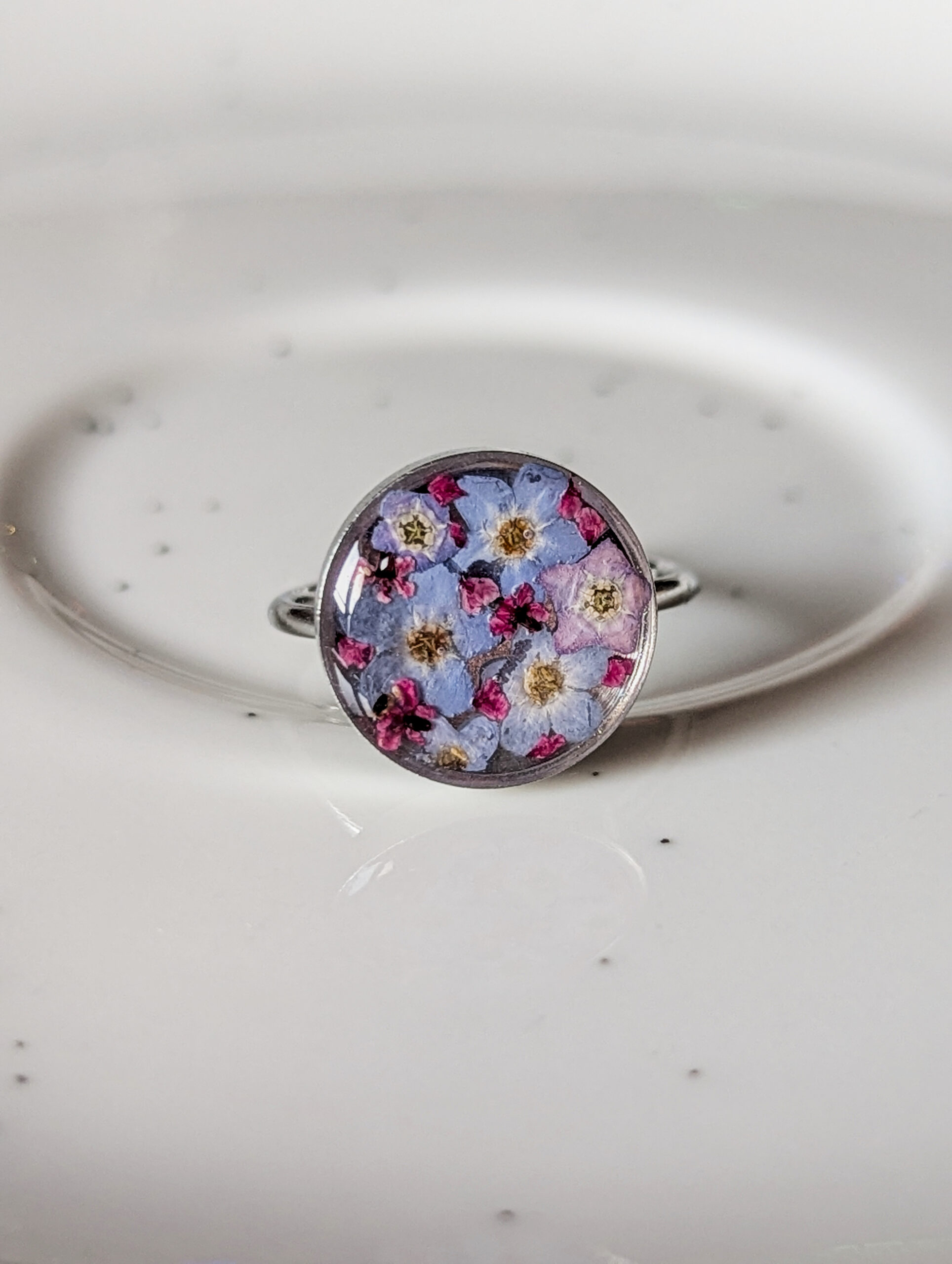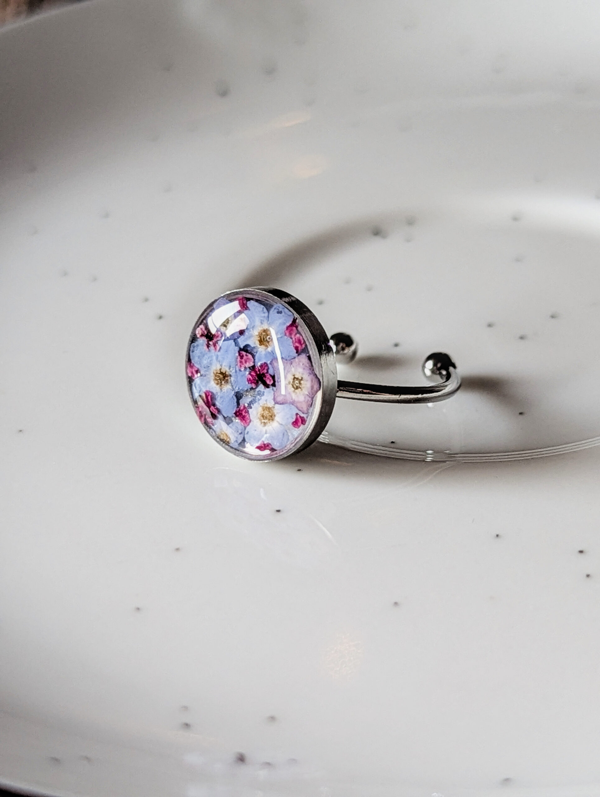 Round silver adjustable ring made out of mixed flowers embedded in resin.