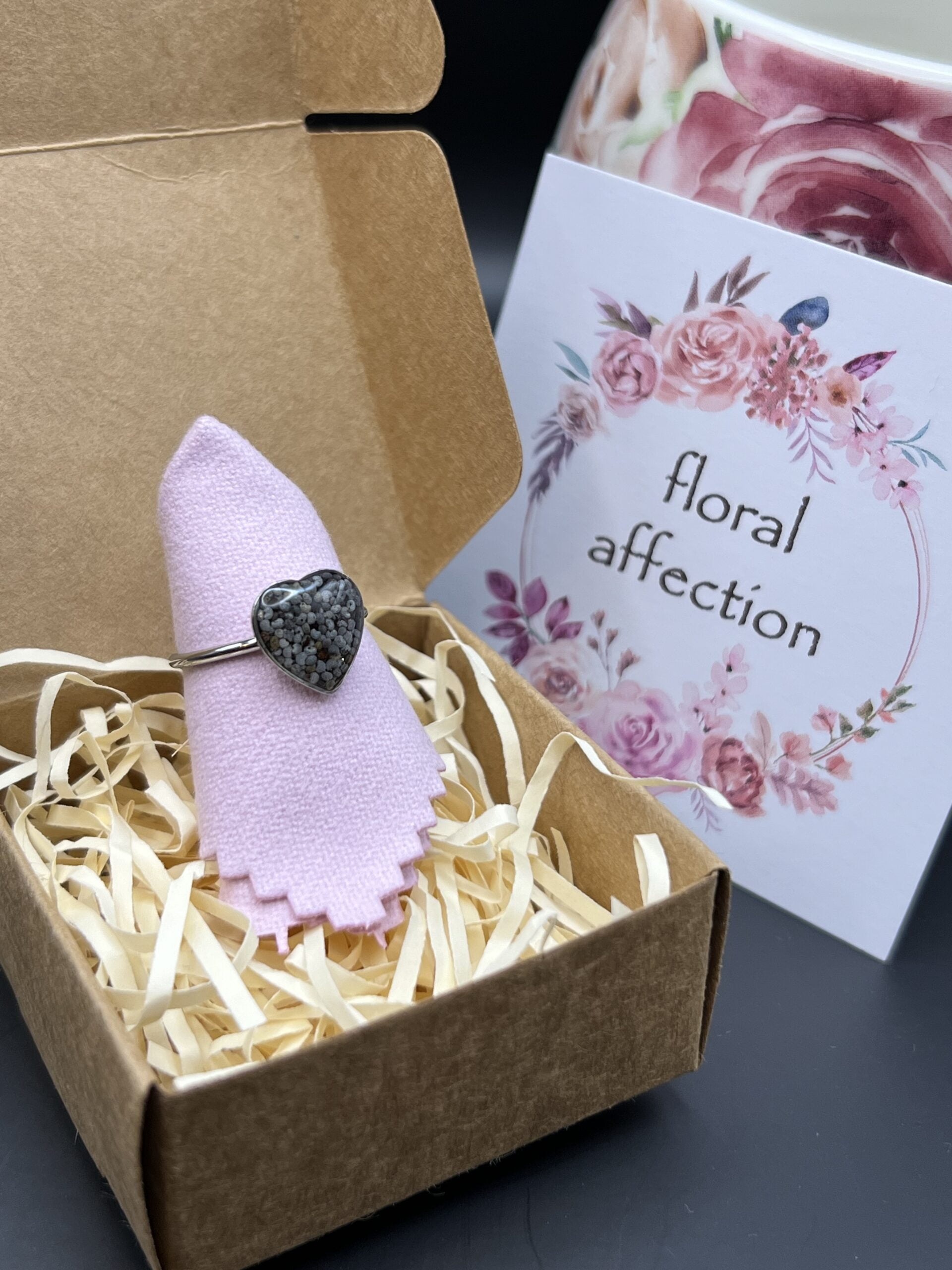 Heart adjustable ring made out of poppy seeds embedded in resin.