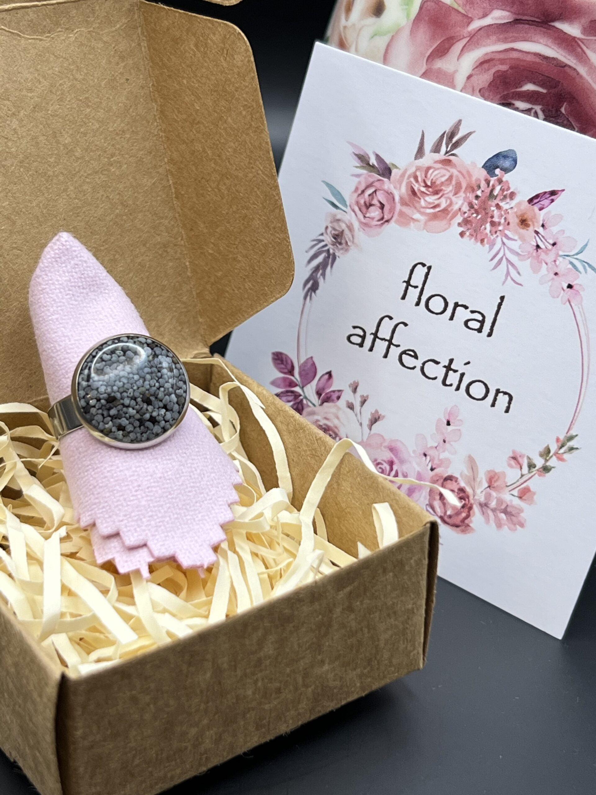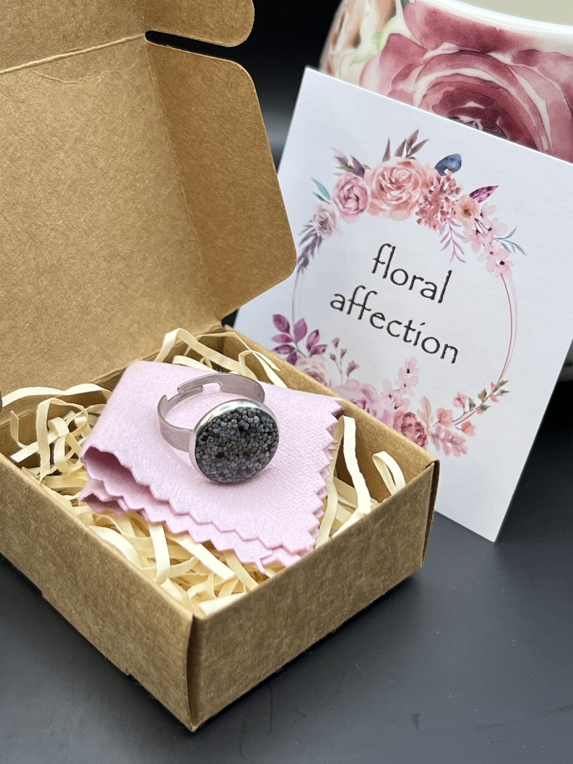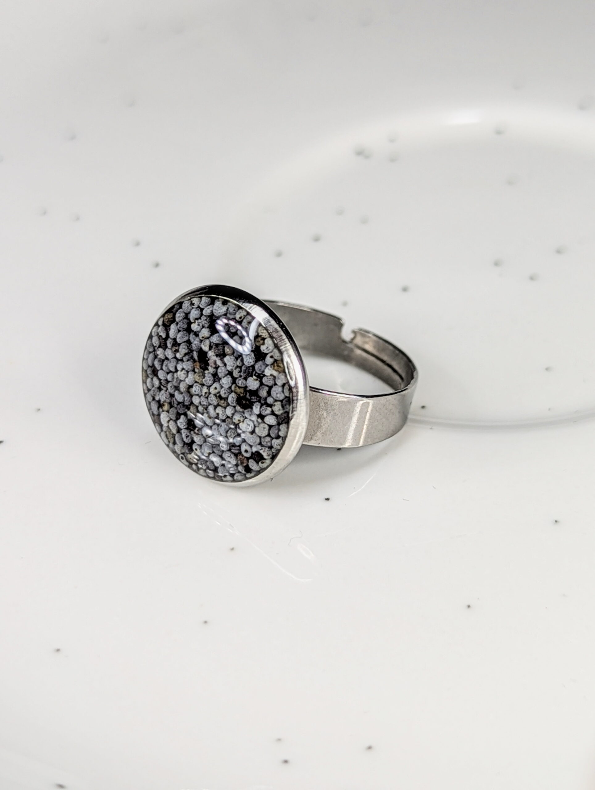 Round adjustable ring made out of poppy seeds embedded in resin.