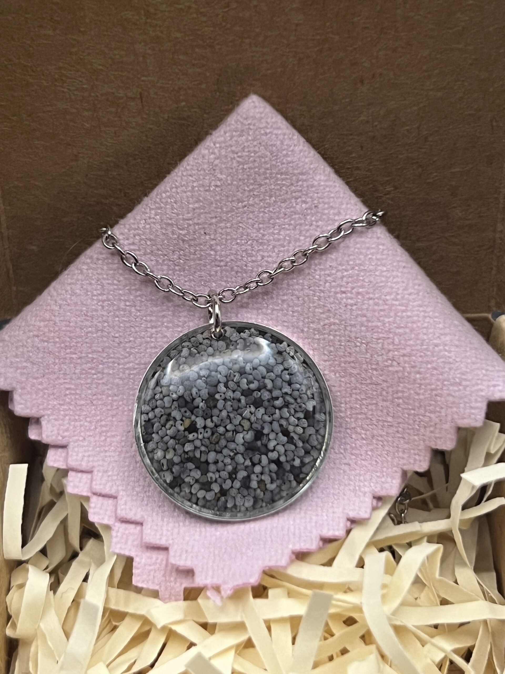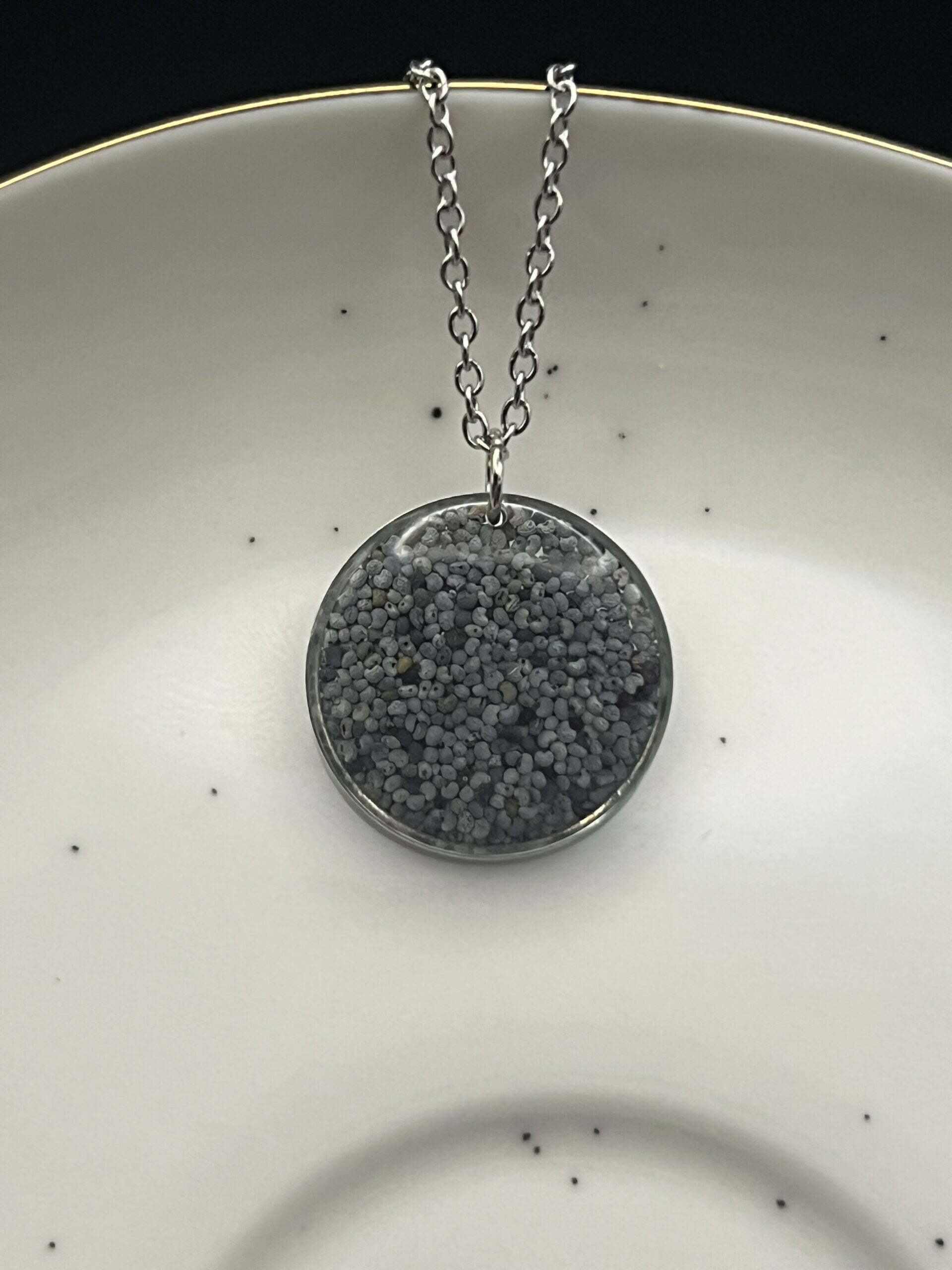 Round necklace made out of poppy seeds embedded in epoxy resin.