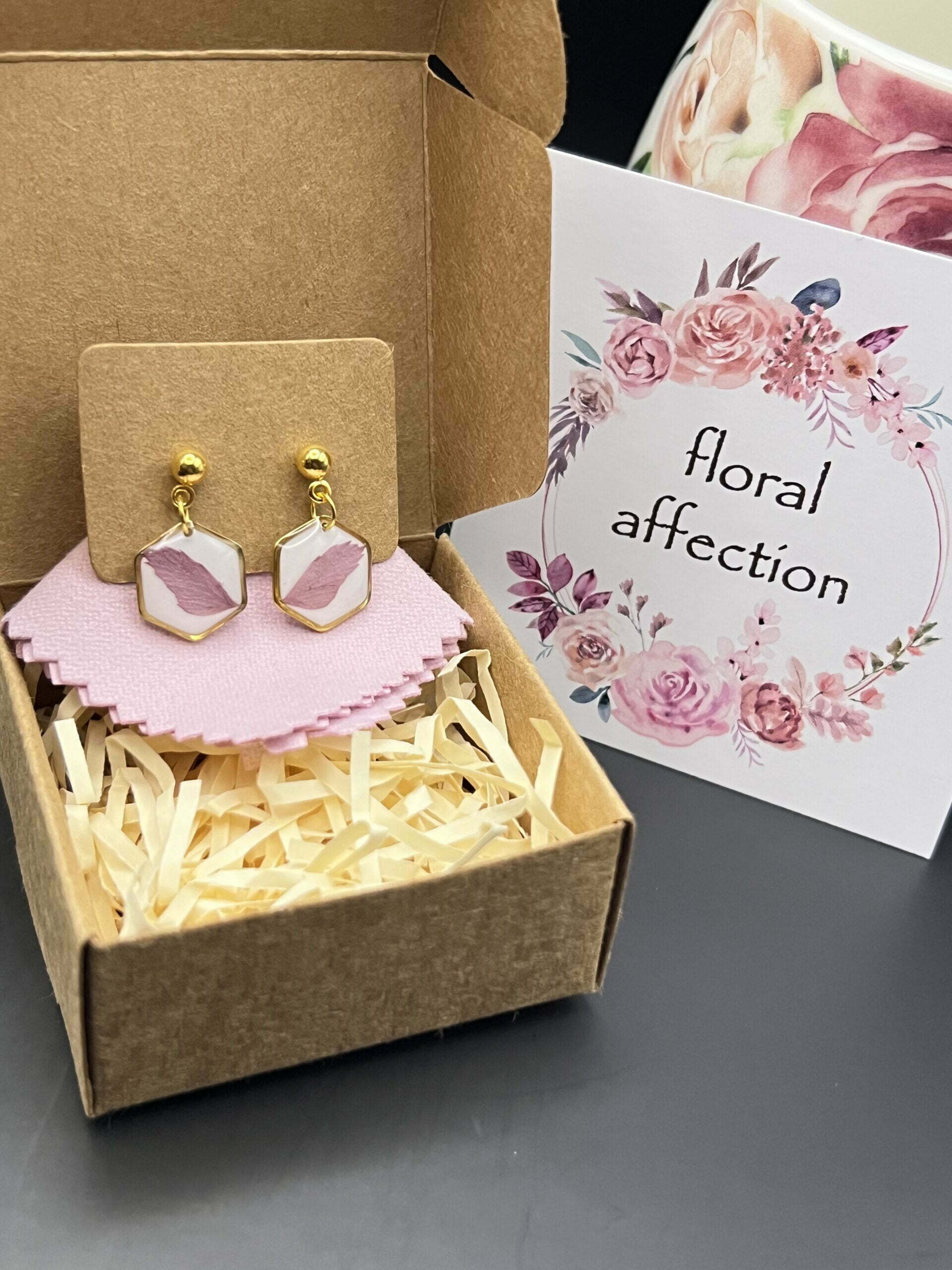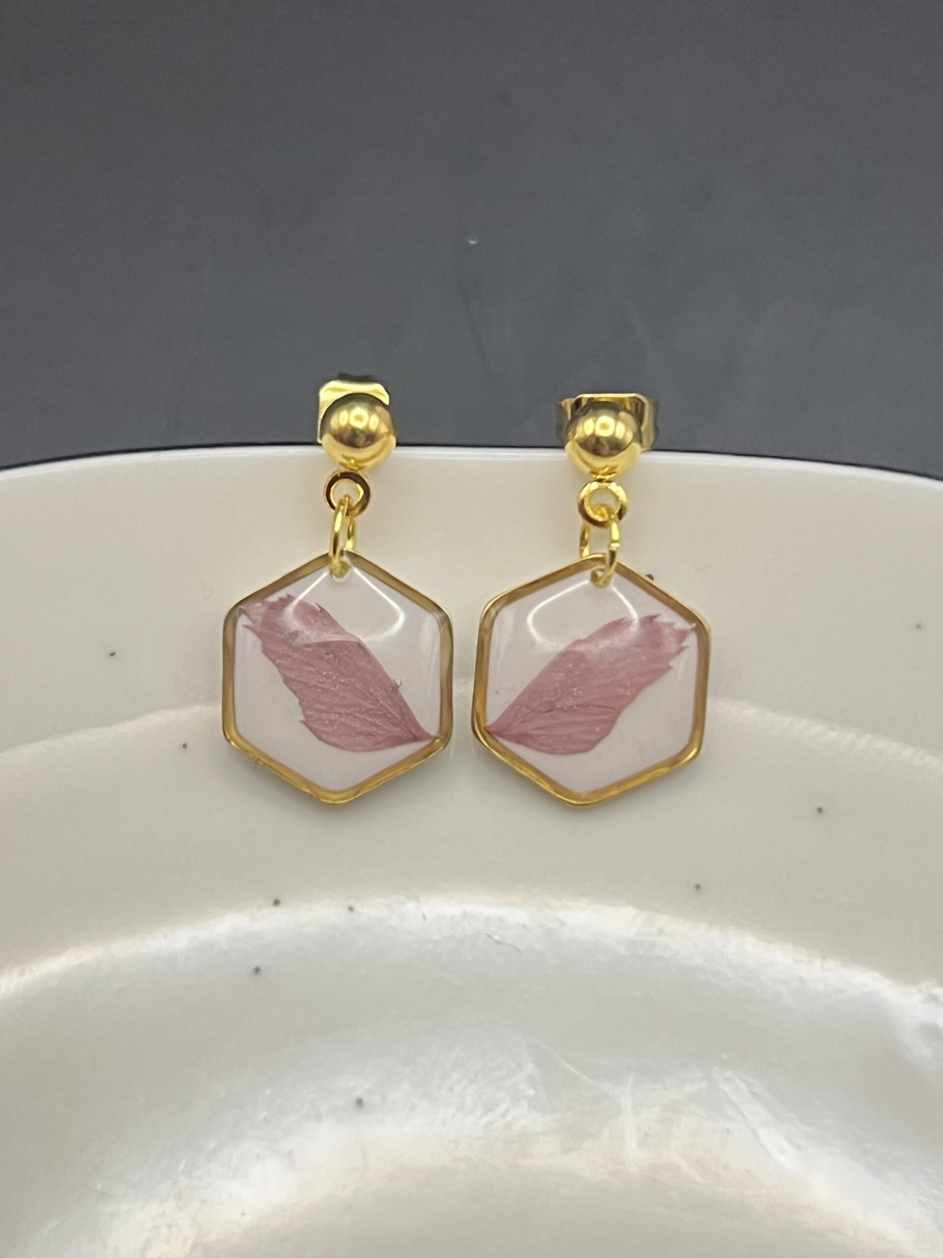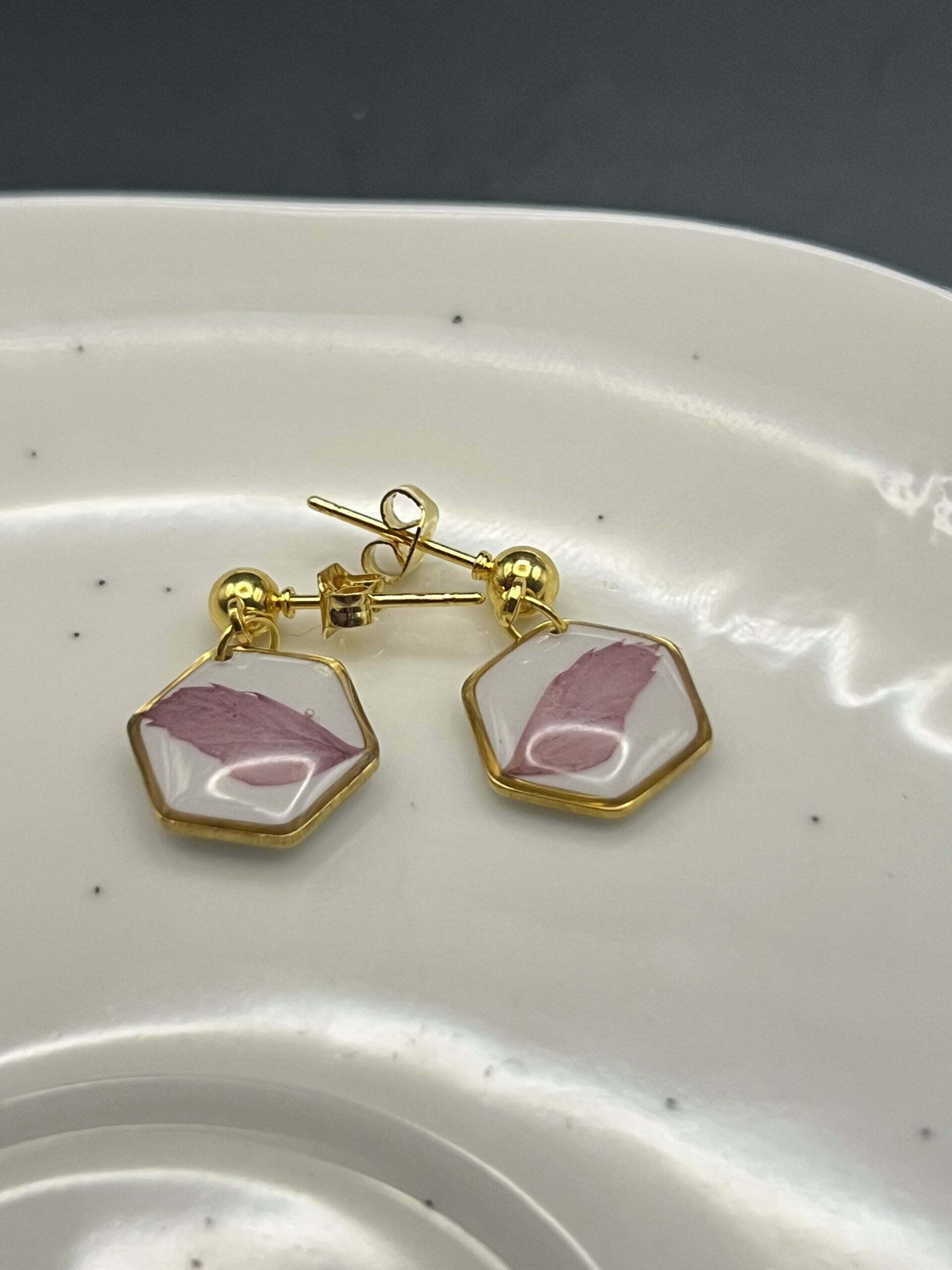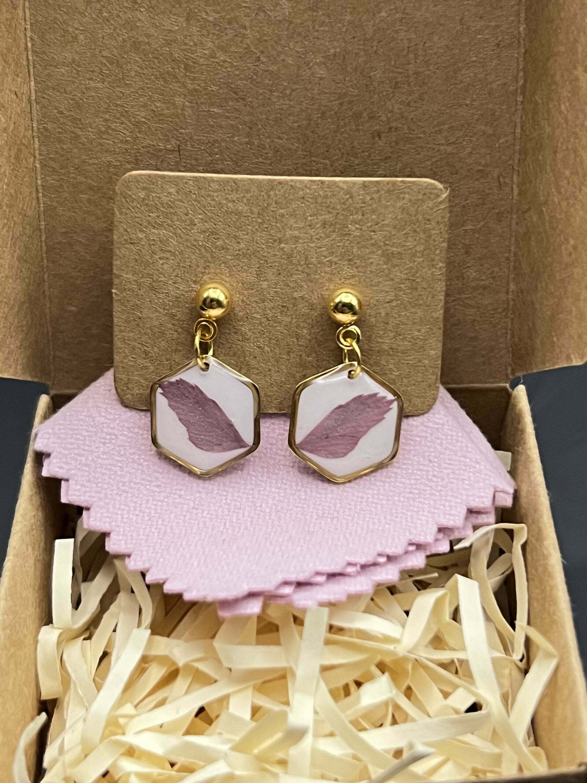 Hexagon earrings made out of purple fern embedded in epoxy resin.