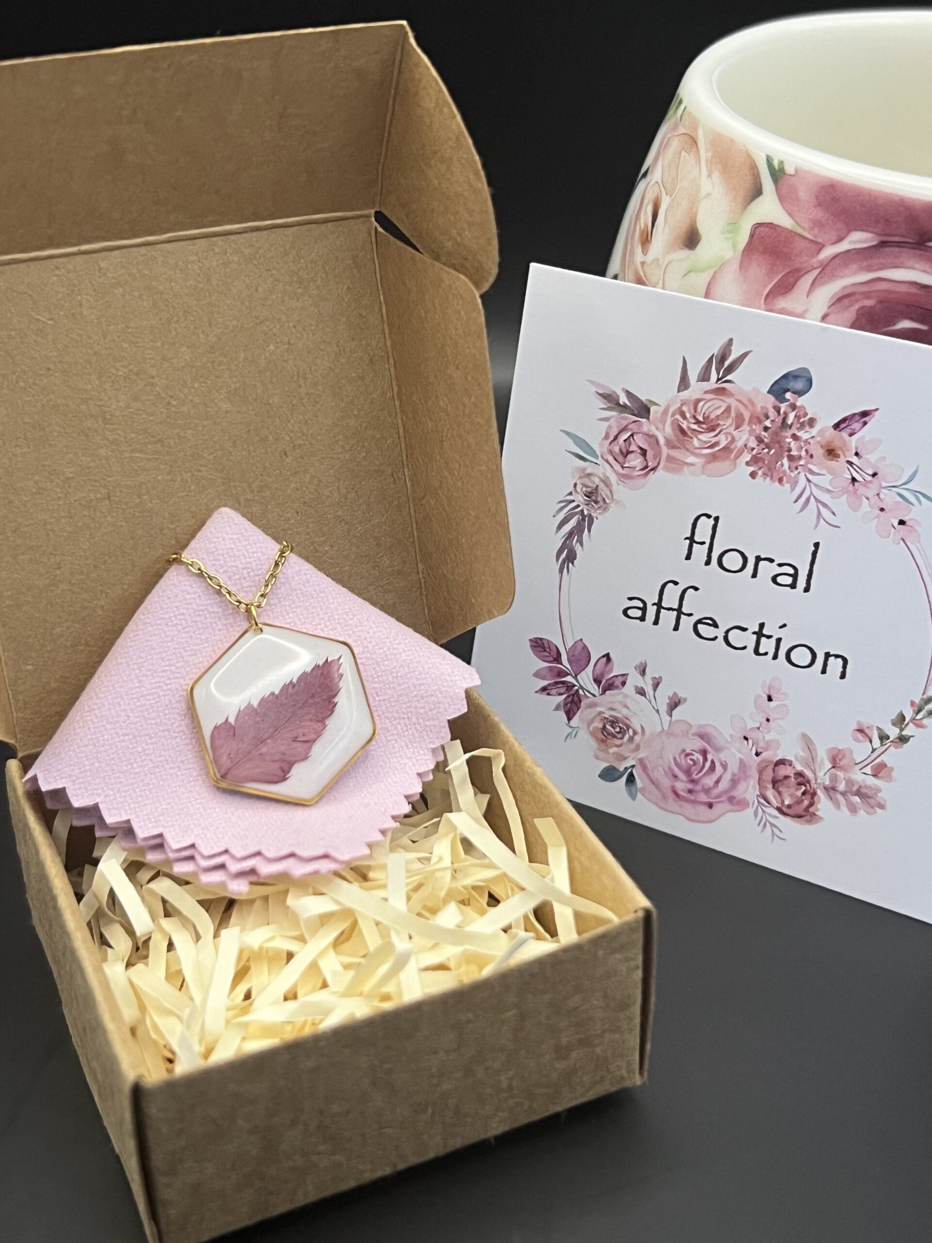 Hexagon necklace made out of purple fern embedded in epoxy resin.