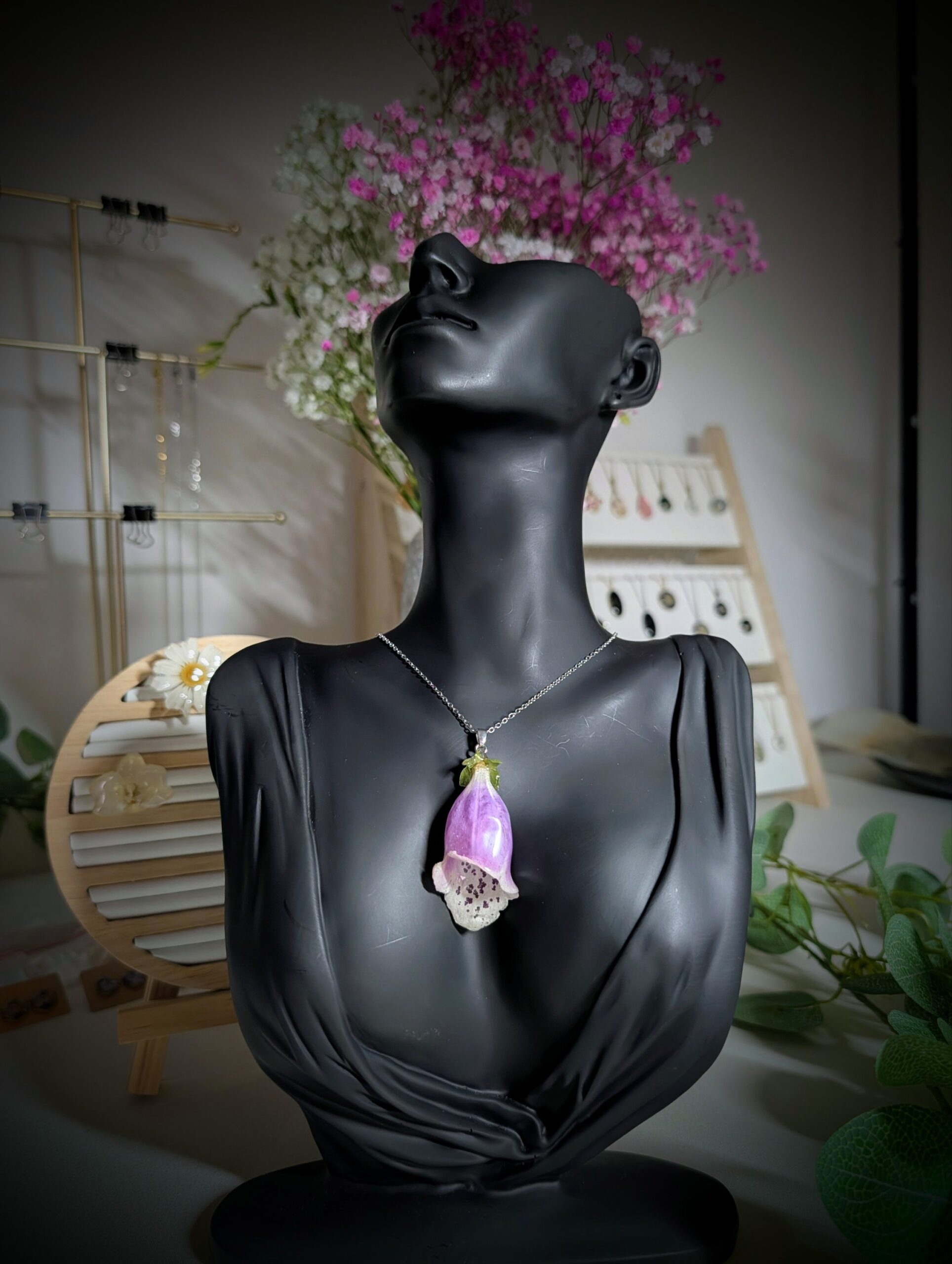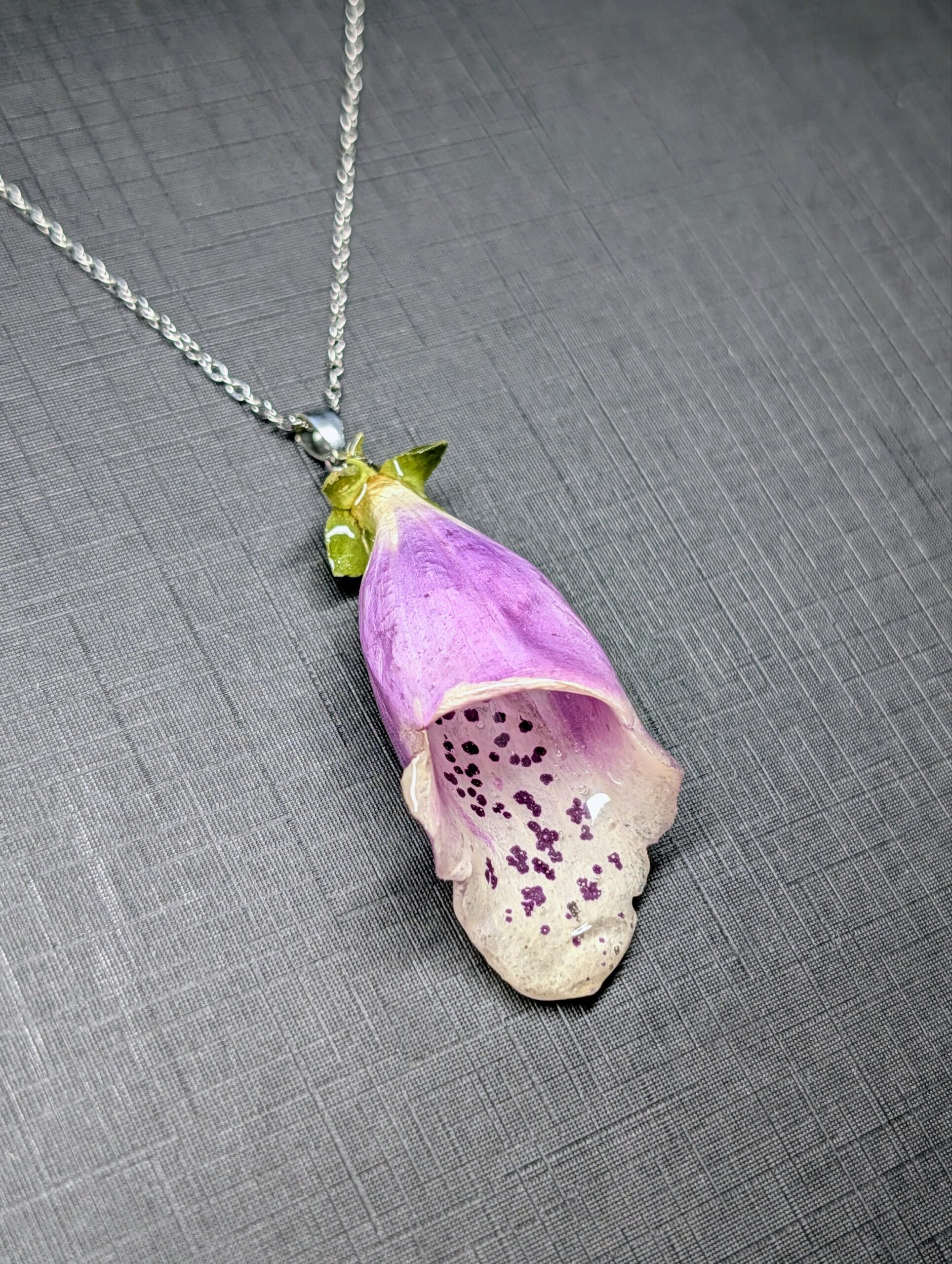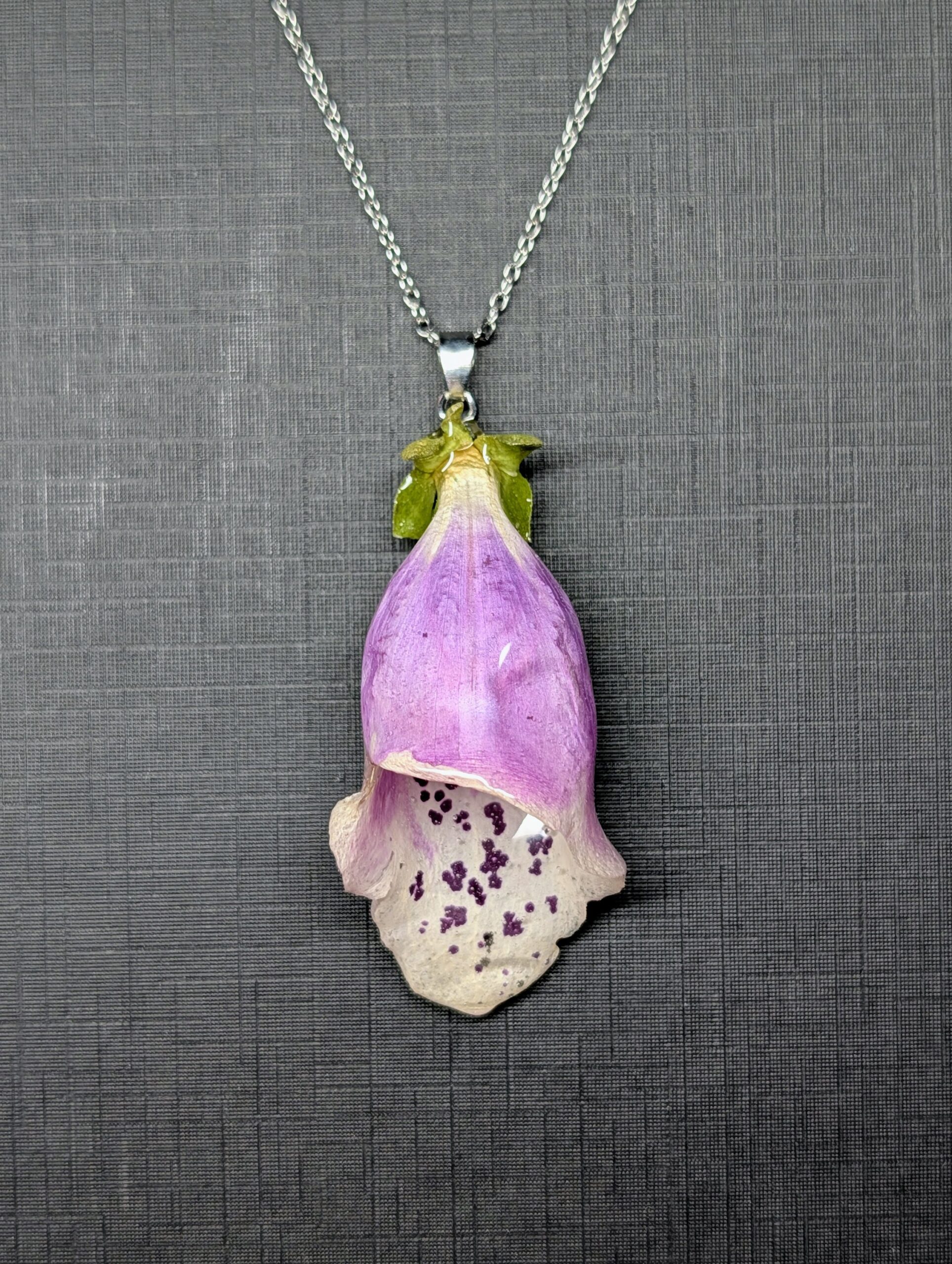 Necklace made with real foxglove flower embedded in resin.