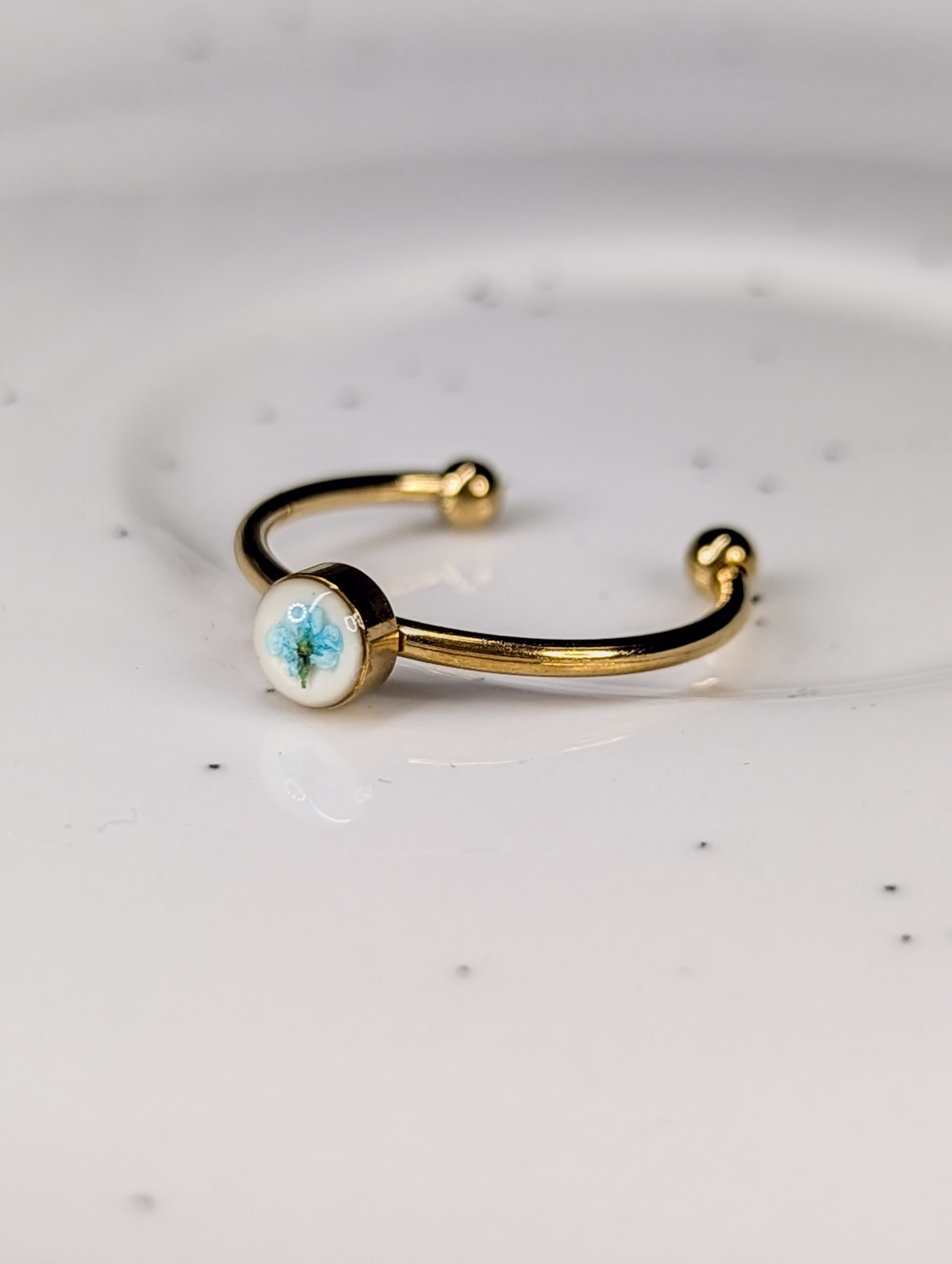 Round gold adjustable ring made out of mint Queen Anne’s Lace flower embedded in resin.