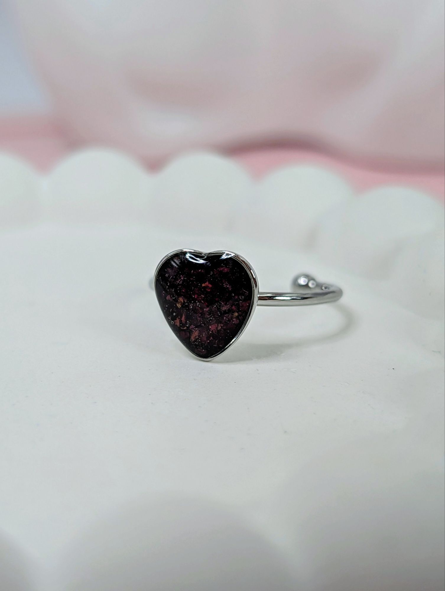 Heart adjustable ring made out of crushed rose petals embedded in resin.