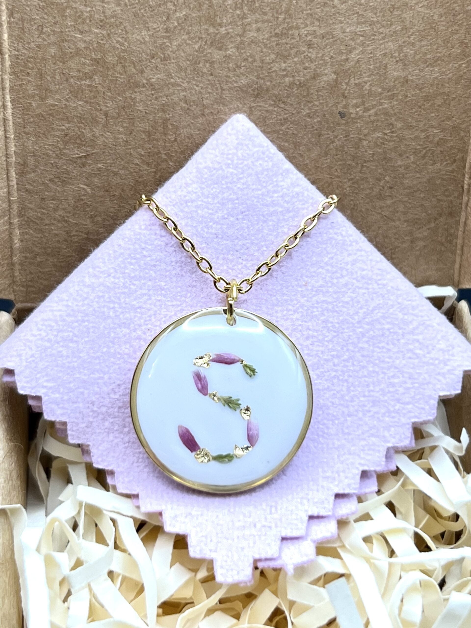 Round necklace with letter S made out of heather embedded in epoxy resin.