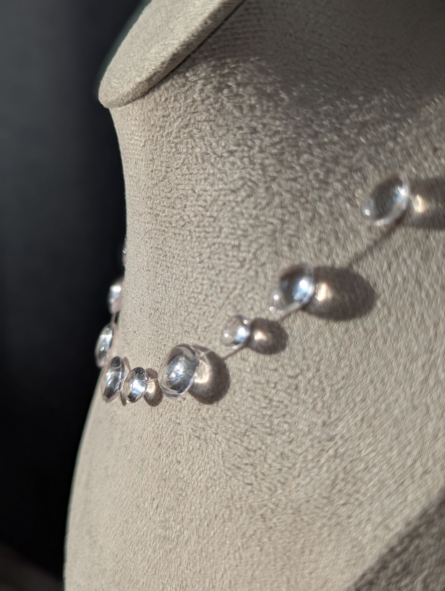 Elegant necklace featuring clear resin beads strung on transparent fishing line, creating a beautiful floating water drop effect.