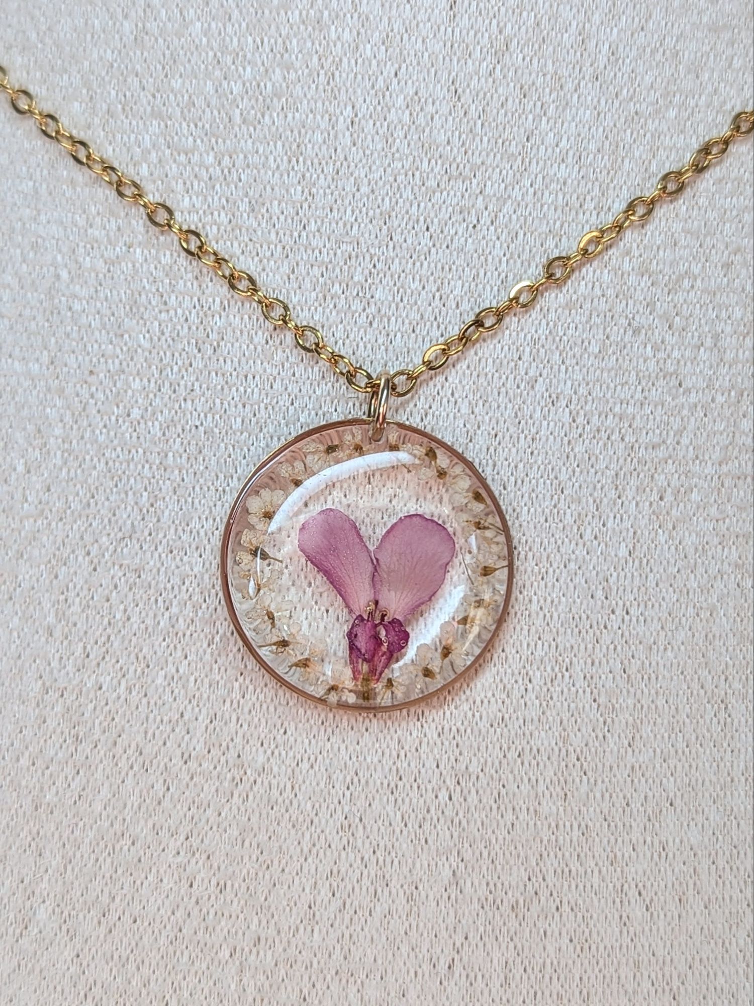 Round necklace made out of a pink wildflower & Queen Anne’s Lace flowers embedded in resin.